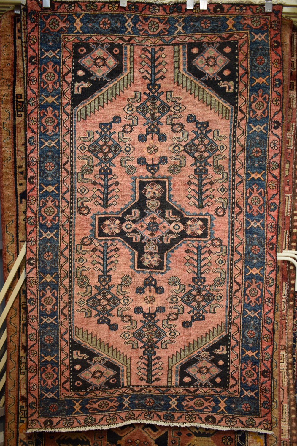 A VINTAGE TRIBAL PERSIAN ABHAR RUG. 100% WOOL. NATURAL DYES. VINTAGE PILE. HAND-KNOTTED VILLAGE WEAVE. TRIBAL DESIGN OF BOLD GEOMETRIC MEDALLION AND CORNER MEDALLIONS IN A FIELD OF BOLD HERATI MAHI PATTERNS. BORDER OF HERATI PALMETTES. FULLY RESTORED AND IN GOOD CONDITION. CERTIFICATE OF AUTHENTICITY INCLUDED. SIZE: 215X127CM ORIGIN: PERSIA - RRP: $1,900
