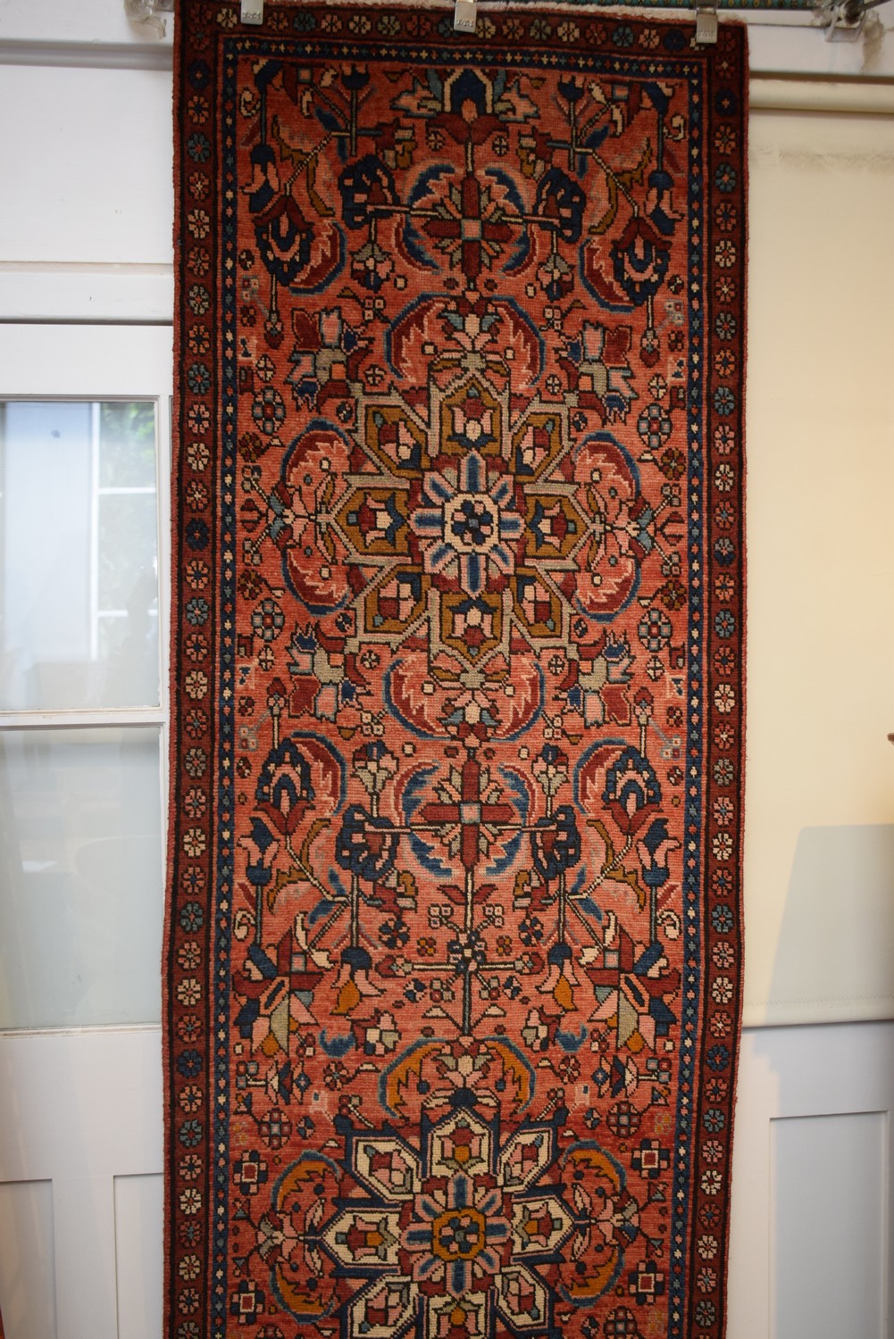A PERSIAN HASHTROOD HALL RUNNER. 100% WOOL. DENSE PILE. HAND-KNOTTED VILLAGE WEAVE FROM THE EAST AZERBAIJAN PROVINCE WITH CAUCASIAN-INFLUENCED DESIGN OF TRIPLE STYLIZED FLORAL MEDALLION IN A RED FIELD OF FLORAL MOTIFS. BORDER OF FLOWER HEADS. SOLID & HARD-WEARING. EX-GALLERY STOCK. IN EXCELLENT CONDITION. CERTIFICATE OF AUTHENTICITY INCLUDED. SIZE: 375X89CM ORIGIN: PERSIA - RRP: $3,300