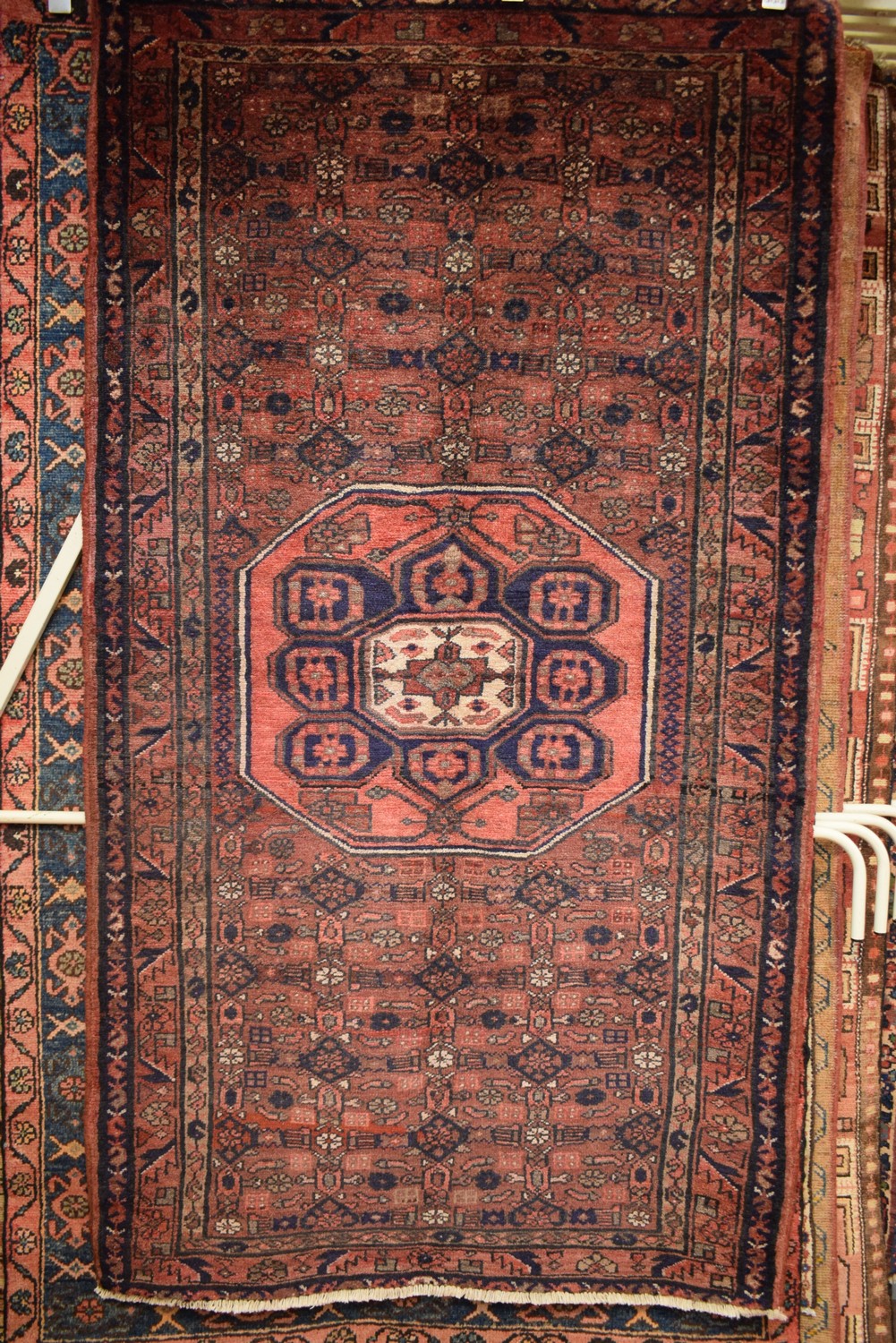 A PERSIAN HAMADAN RUG. 100% WOOL. DENSE PILE. VILLAGE WEAVE FROM THE HAMADAN REGION WITH TRIBAL DESIGN OF BOLD ANGULAR MEDALLION IN A FIELD OF FLORAL HERATI MAHI PATTERNS. EX-GALLERY INVENTORY. IN EXCELLENT CONDITION. CERTIFICATE OF AUTHENTICITY INCLUDED. SIZE: 198X109CM ORIGIN: PERSIA - RRP: $1,400