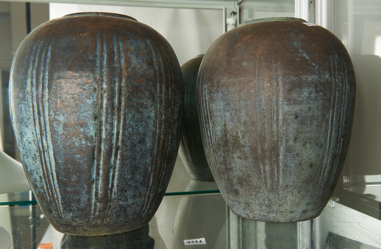 A PAIR OF HANDMADE COPPER GARDEN VASES (29CM HIGH), LEONARD JOEL LOCAL DELIVERY SIZE: SMALL
