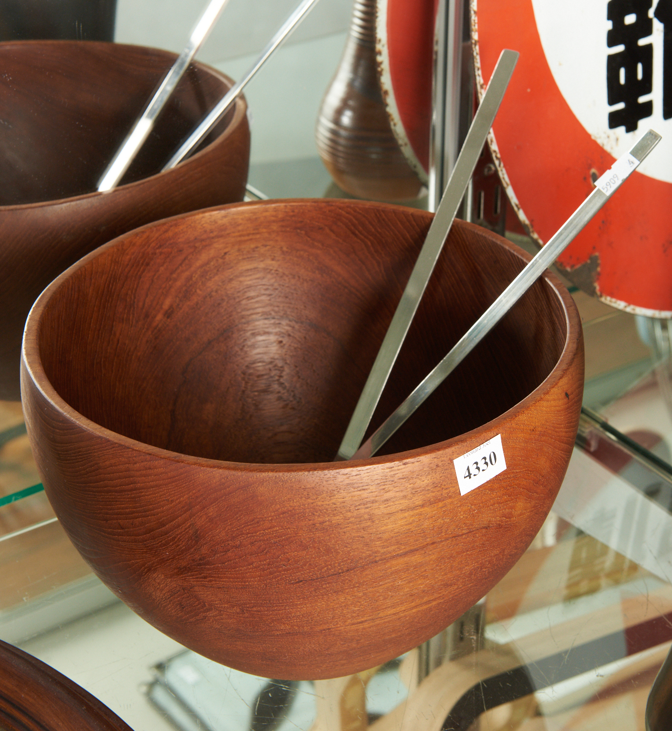 A DANISH MID-CENTURY TEAK SALAD BOWL WITH STAINLESS STEEL SERVERS (26 CM DIAMETER), LEONARD JOEL LOCAL DELIVERY SIZE: SMALL