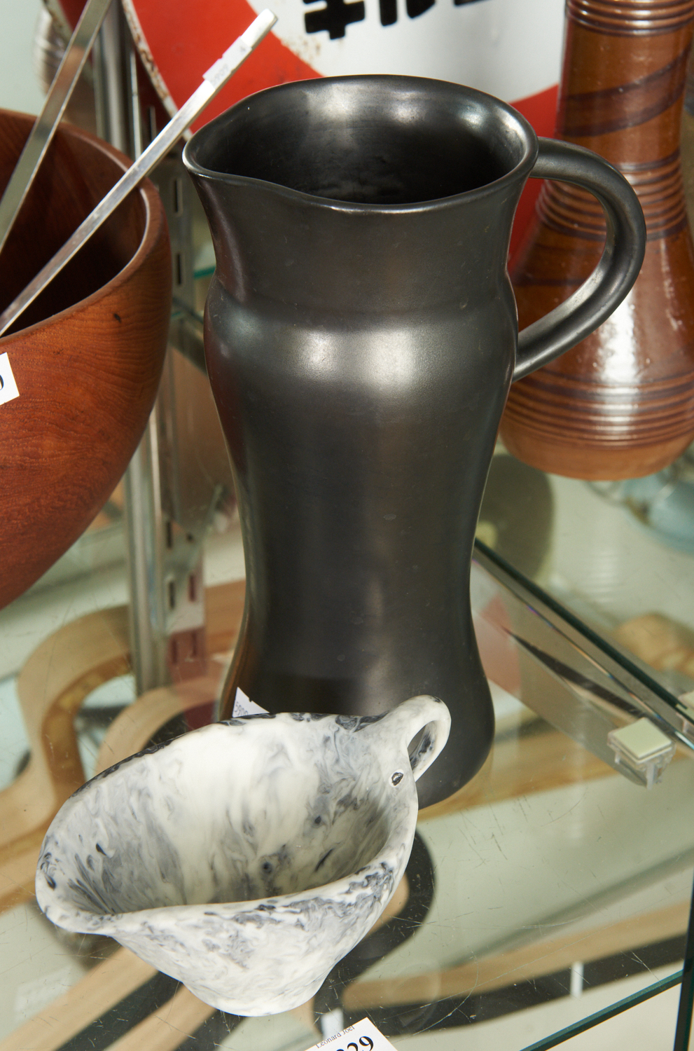 AN AUSTRALIAN MATTE BLACK CERAMIC JUG BY SYLHA AND A RESIN JUG BY ALICE KEEP (24 CM HIGH), LEONARD JOEL LOCAL DELIVERY SIZE: SMALL