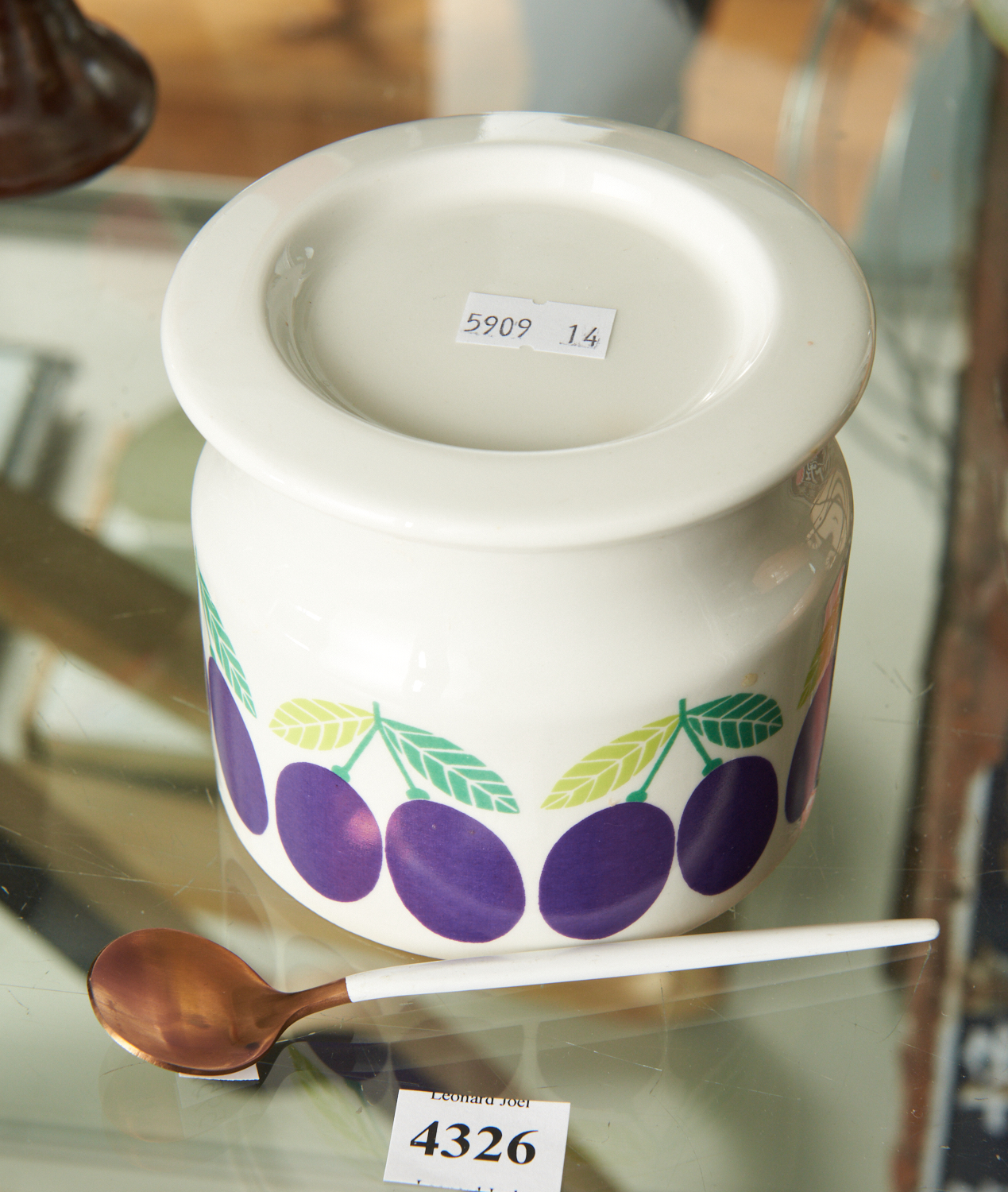 AN ARABIA FINLAND PURPLE PLUM JAM POT WITH LID AND SPOON (10 CM HIGH), LEONARD JOEL LOCAL DELIVERY SIZE: SMALL