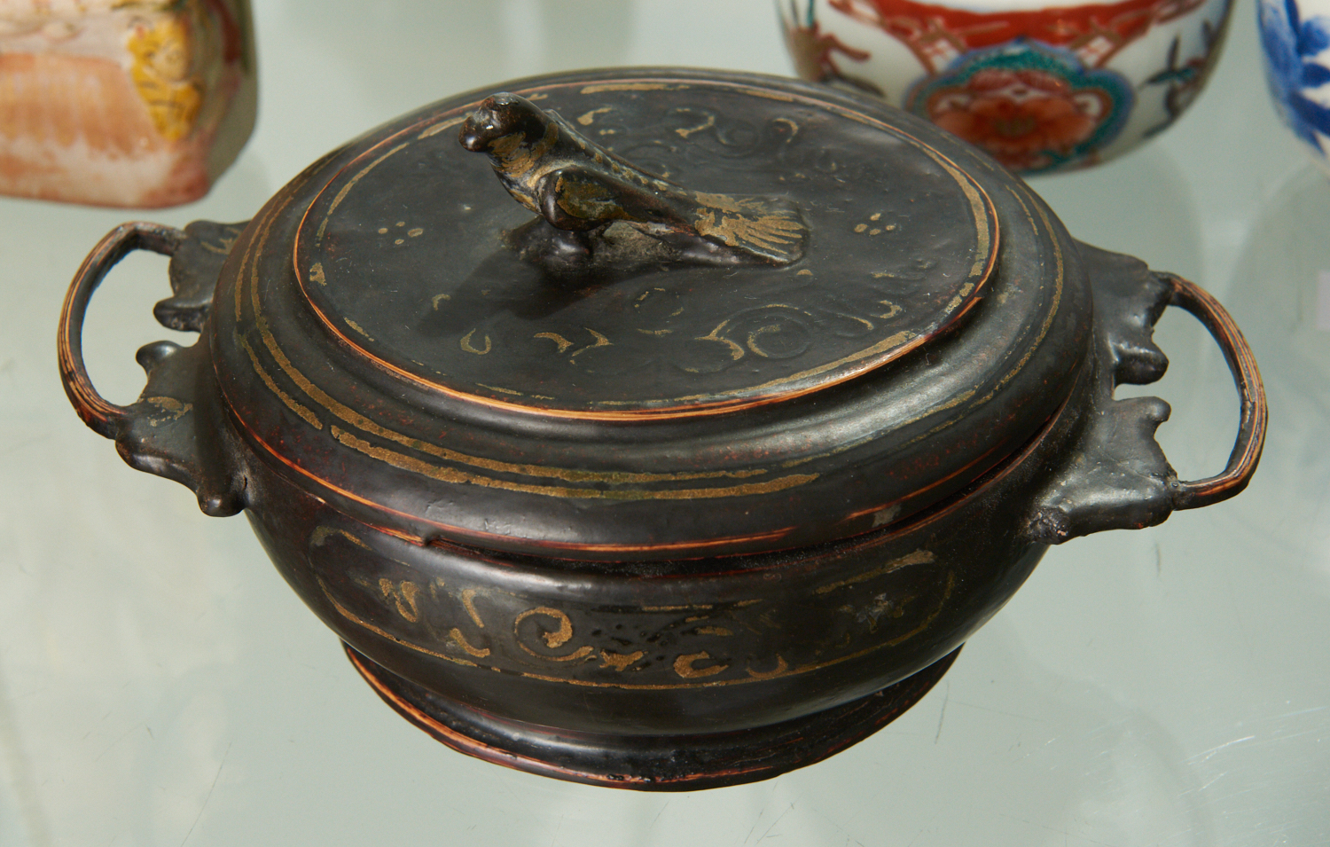 AN ANTIQUE BURMESE BLACK LACQUER BOWL AND LID WITH CINNABAR RED LACQUER INTERIOR (19 CM WIDE), LEONARD JOEL LOCAL DELIVERY SIZE: SMALL