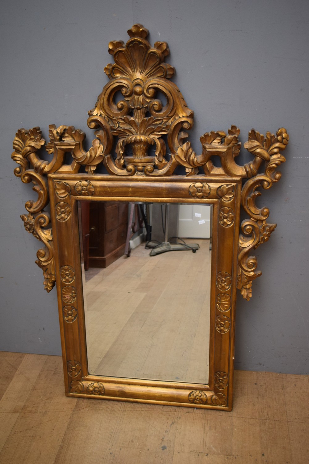 A DECORATIVE GILT EFFECT MIRROR (A/F) ( 144H X 98W CM) (LEONARD JOEL DELIVERY SIZE: LARGE)