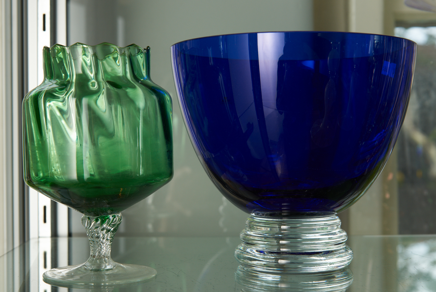 A BLUE GLASS BOWL AND A GREEN GLASS FOOTED VASE, LEONARD JOEL LOCAL DELIVERY SIZE: SMALL