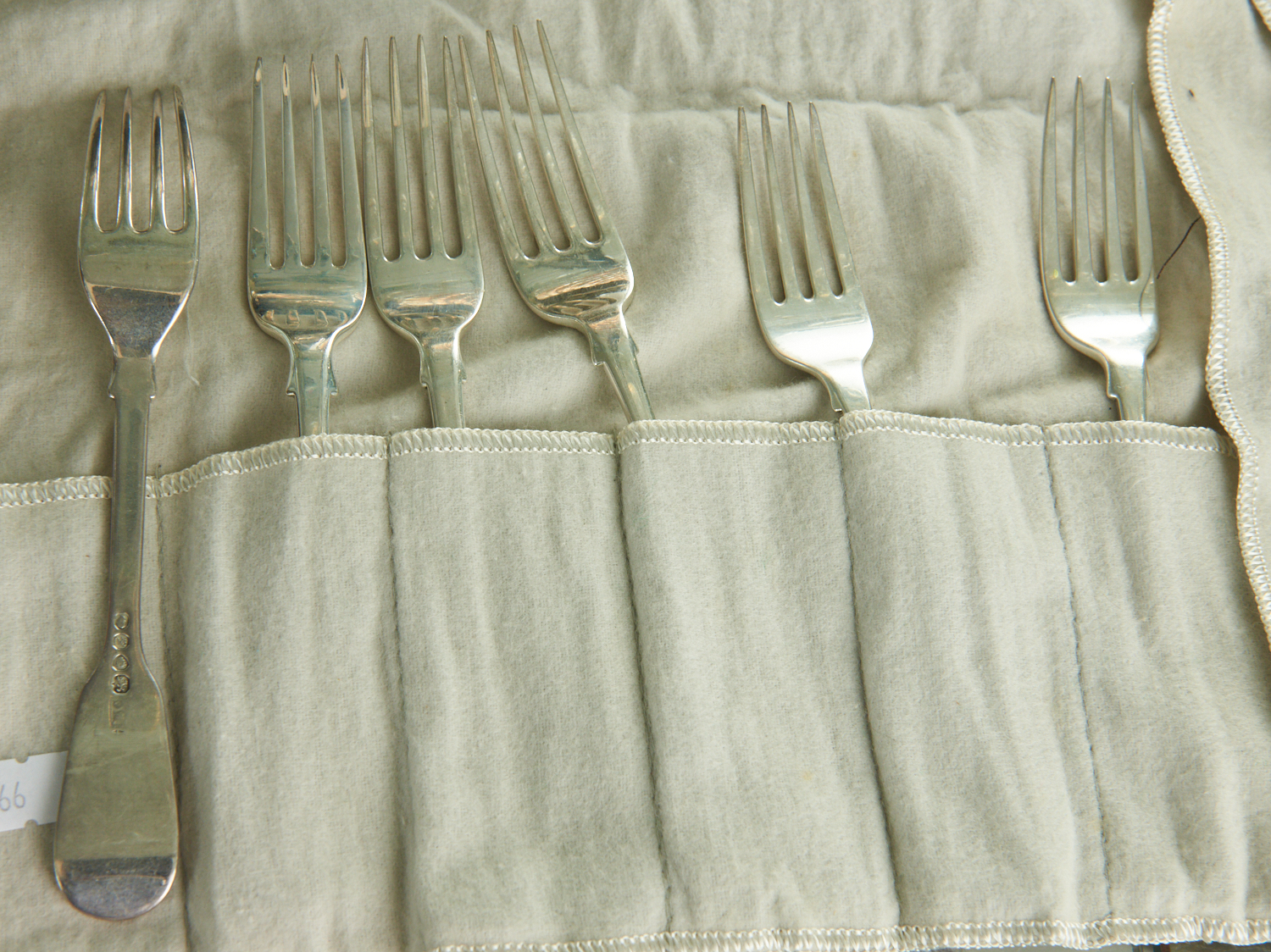 SIX 19TH CENTURY STERLING SILVER FIDDLE PATTERN ENTREE FORKS, FIVE WITH MAKER'S MARK RUBBED, LONDON 1829-1836, ONE JOHN LIAS & HENRY LIAS, LONDON, 1837, APPROXIMATELY 227 GMS, LEONARD JOEL LOCAL DELIVERY SIZE: SMALL