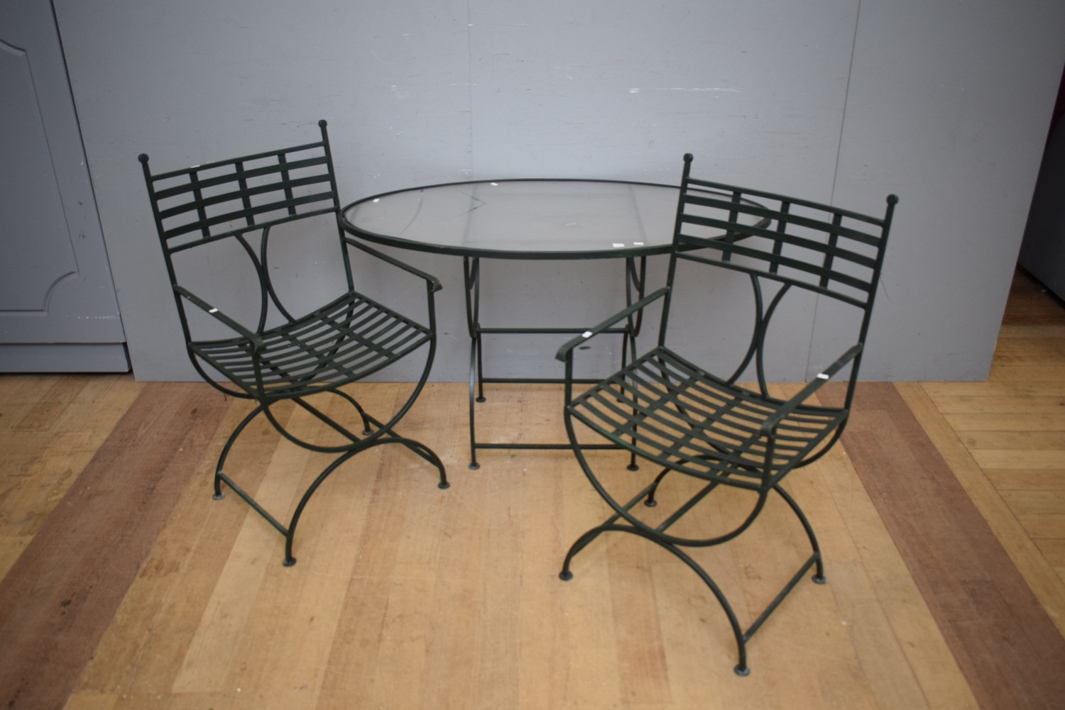 A THREE PIECE WROUGHT IRON OUTDOOR SETTING (A/F) (TABLE 72H x 120W x 62D CM) (LEONARD JOEL DELIVERY SIZE: LARGE)