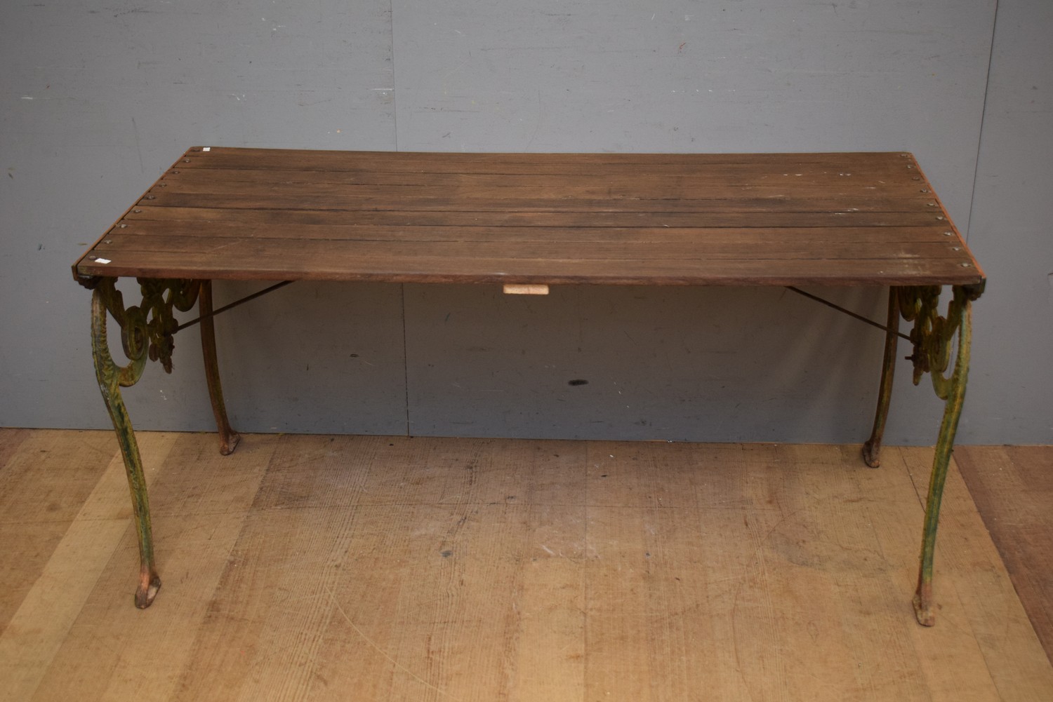 A TIMBER CAST IRON BASE OUTDOOR TABLE ( 63H X 140W X 65D CM) (LEONARD JOEL DELIVERY SIZE: LARGE)
