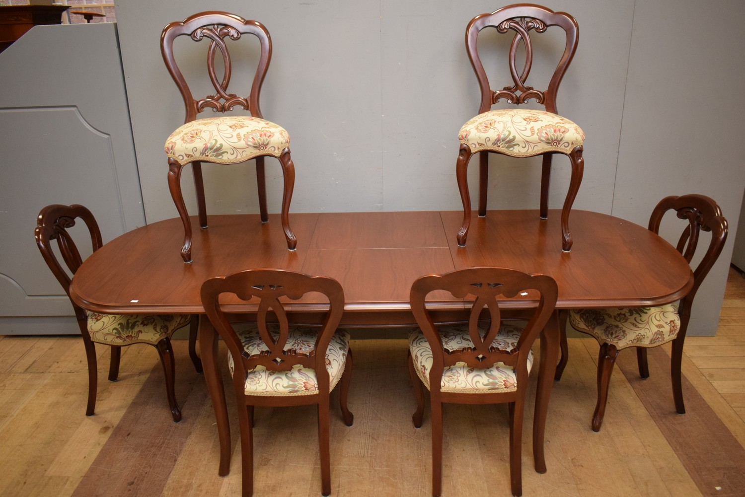 A SEVEN PIECE DINING SETTING WITH EXTENSION DINING TABLE (74H X 235W X 102D CM) (PLEASE NOTE THIS HEAVY ITEM MUST BE REMOVED BY CARRIERS AT THE CUSTOMER'S EXPENSE. LEONARD JOEL STAFF CANNOT ASSIST CARRYING THIS ITEM)