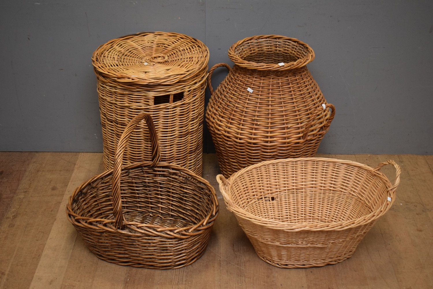 FOUR VINTAGE CANE BASKETS (LARGEST 63H x 45W CM) (LEONARD JOEL DELIVERY SIZE: LARGE)