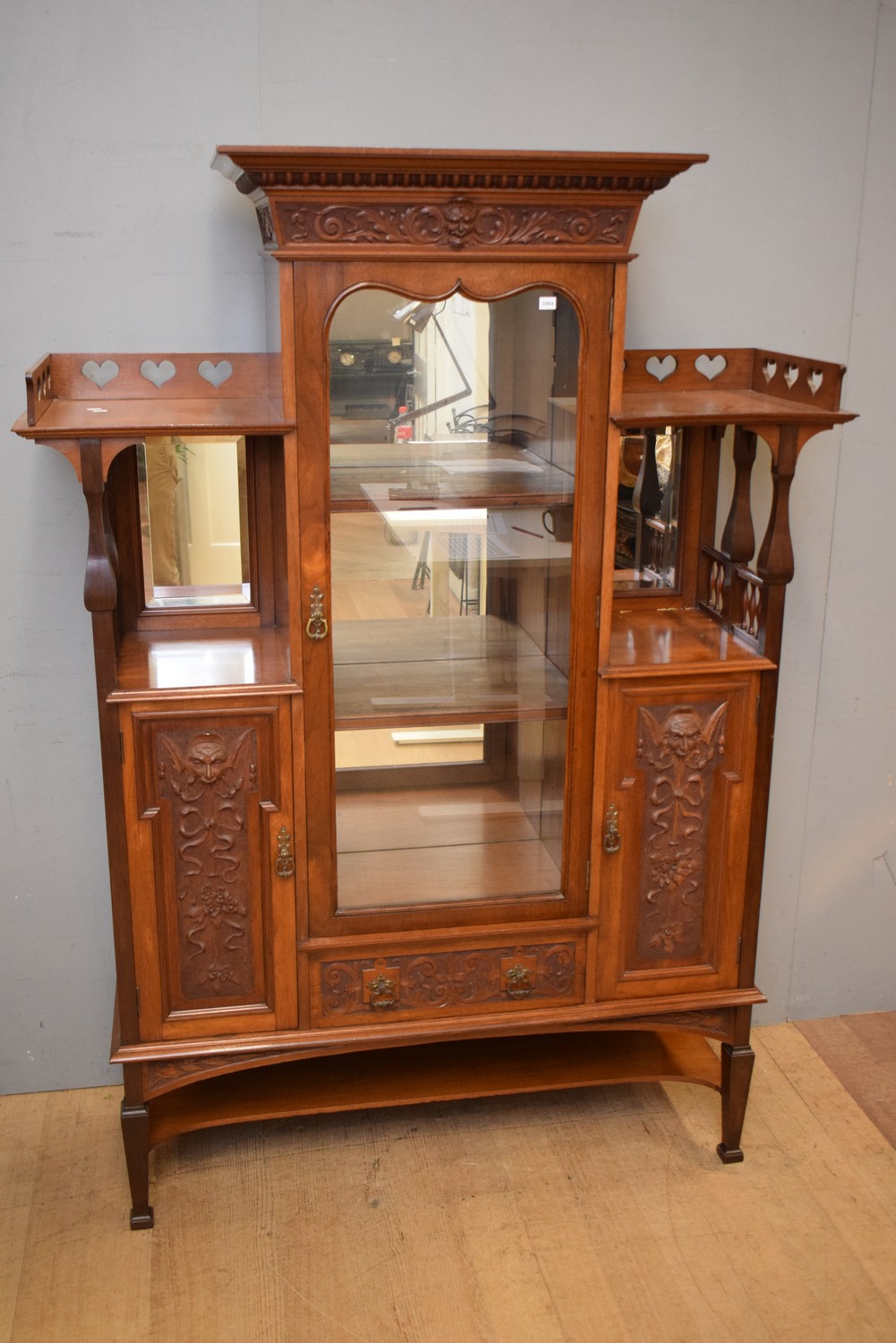 A 'BUCKLEY & NUNN' STAMPED SOLID WALNUT ARTS AND CRAFTS STYLE COMBINATION CABINET AND TWO DOOR CUPBOARD WITH CARVED SATYRS AND FOLIATE, PIERCED HEART RAILS, SPINDLE AND PANELLED SIDES, CARVED DRAWER, C 1896 (177H x 132W x 44D CM) (PLEASE NOTE THIS HEAVY ITEM MUST BE REMOVED BY CARRIERS AT THE CUSTOMER'S EXPENSE. LEONARD JOEL STAFF CANNOT ASSIST CARRYING THIS ITEM) (X-LARGE ITEM)