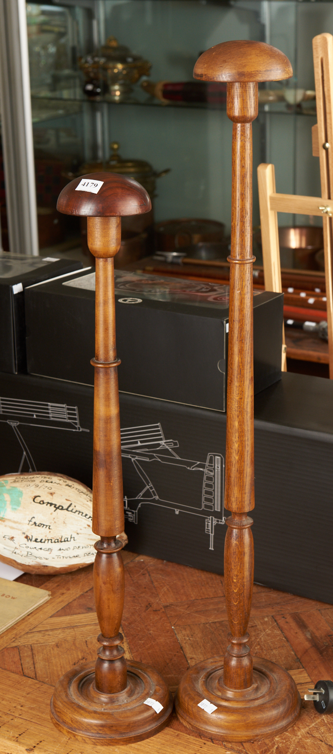 TWO FRENCH TURNED WOOD HAT STANDS, H.77CM AND H.65CM, LEONARD JOEL LOCAL DELIVERY SIZE: SMALL