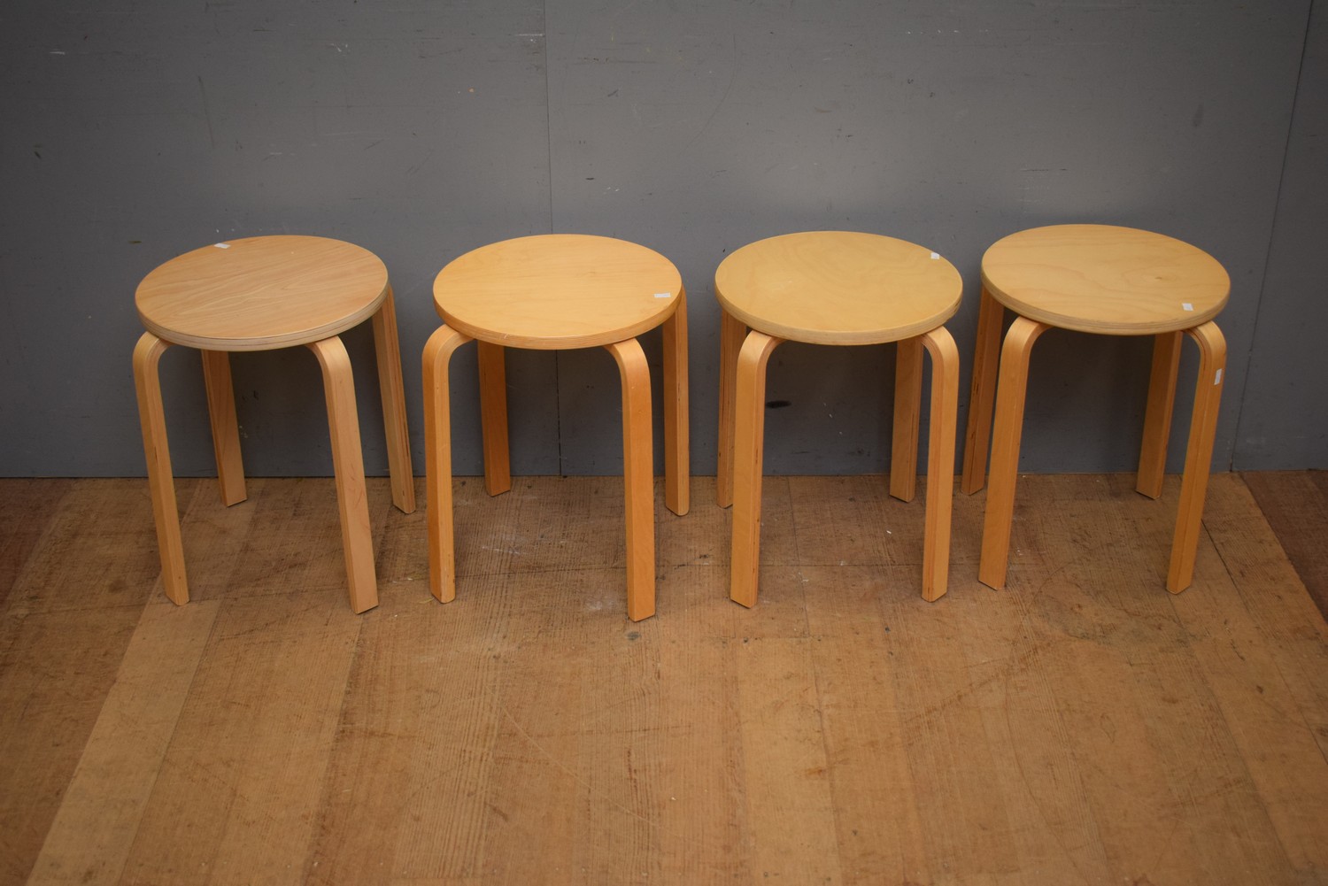 A SET OF FOUR ROUND WOODEN STACKABLE STOOLS (45H x 44D CM) (LEONARD JOEL DELIVERY SIZE: MEDIUM)
