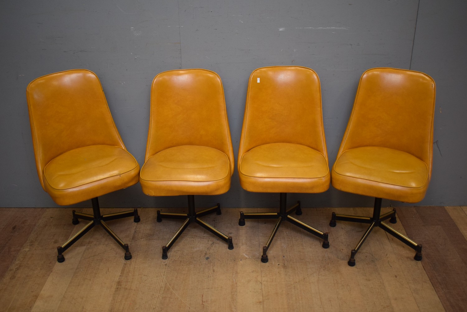 A SET OF FOUR MID-CENTURY MUSTARD VINYL CHAIRS (A/F) ( 84H X 45W X 48D CM) (LEONARD JOEL DELIVERY SIZE: LARGE)