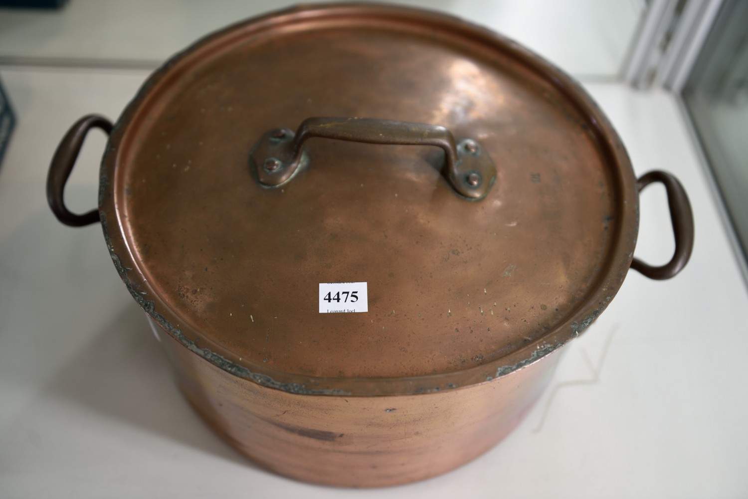 A 19TH CENTURY FRENCH COPPER TWO HANDLED LIDDED PAN, (40 CM W), LEONARD JOEL LOCAL DELIVERY SIZE: SMALL