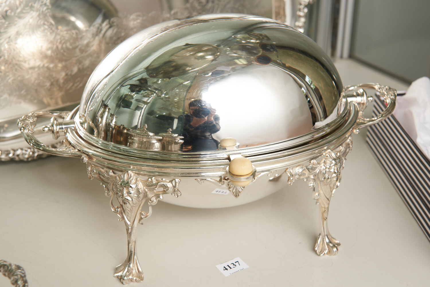 A VICTORIAN SILVER PLATE DOME TOPPED REVOLVING TUREEN BY JAMES DIXON & SONS, 33 CM W, LEONARD JOEL LOCAL DELIVERY SIZE: SMALL