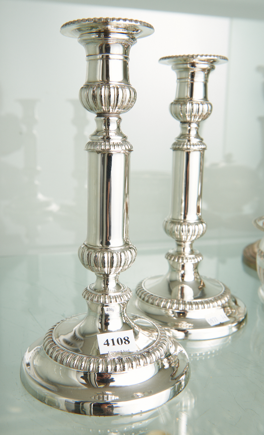 A PAIR OF GEORGIAN SHEFFIELD PLATE TELESCOPIC CANDLESTICKS, LEONARD JOEL LOCAL DELIVERY SIZE: SMALL