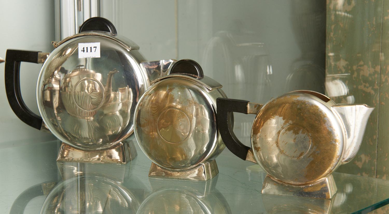 AN ART DECO THREE PIECE SILVER PLATE AND BAKELITE TEA SET, LEONARD JOEL LOCAL DELIVERY SIZE: SMALL