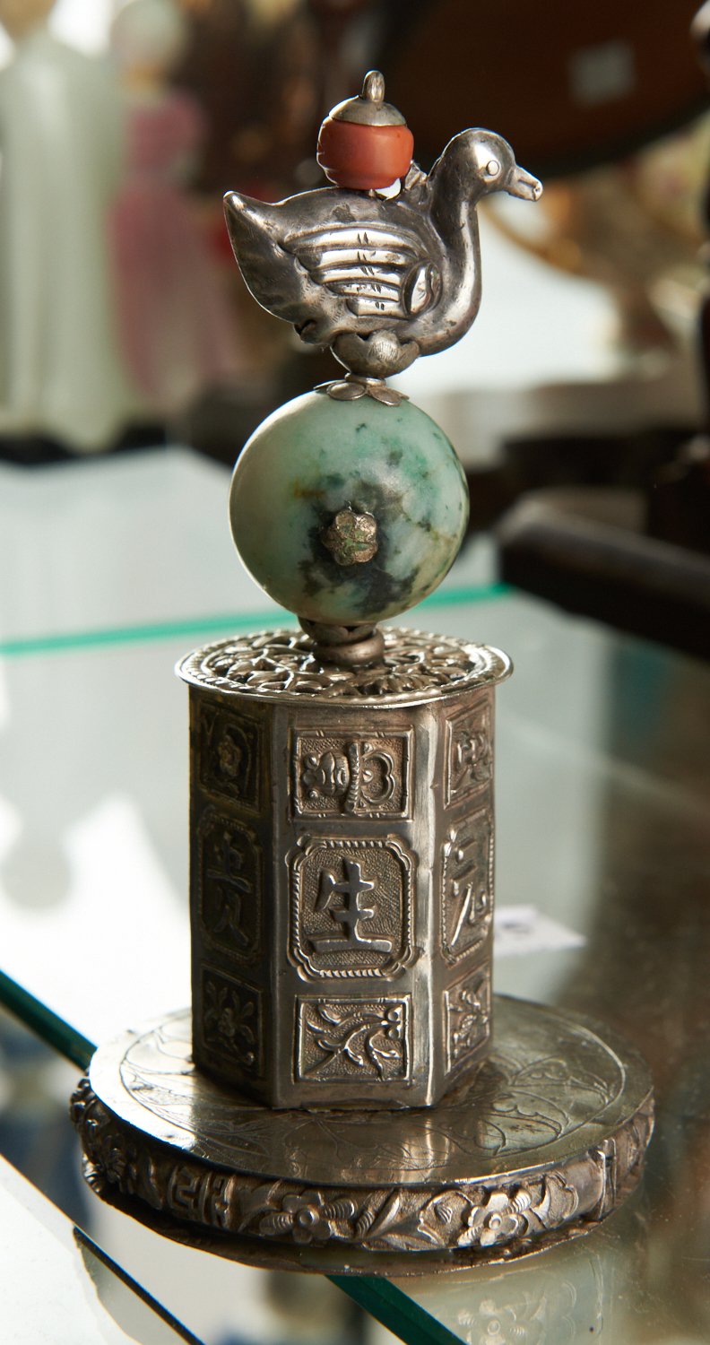 A CHINESE SILVER (UNTESTED) AND JADE BIRD DECORATED STAND WITH CORAL FINIAL, H.14CM, LEONARD JOEL LOCAL DELIVERY SIZE: SMALL