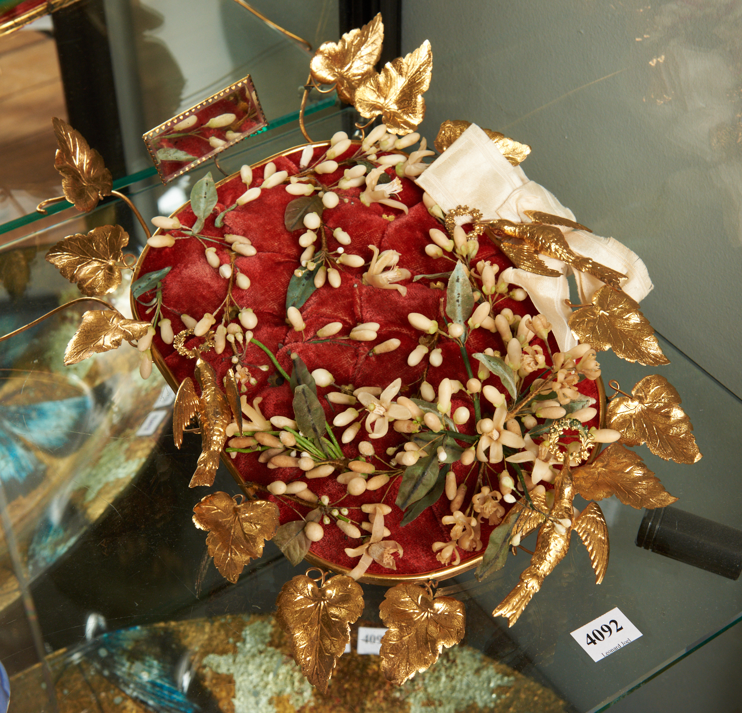 A GILDED METAL, BUTTONED VELVET AND FLORAL DECORATED WALL PLAQUE, LEONARD JOEL LOCAL DELIVERY SIZE: SMALL