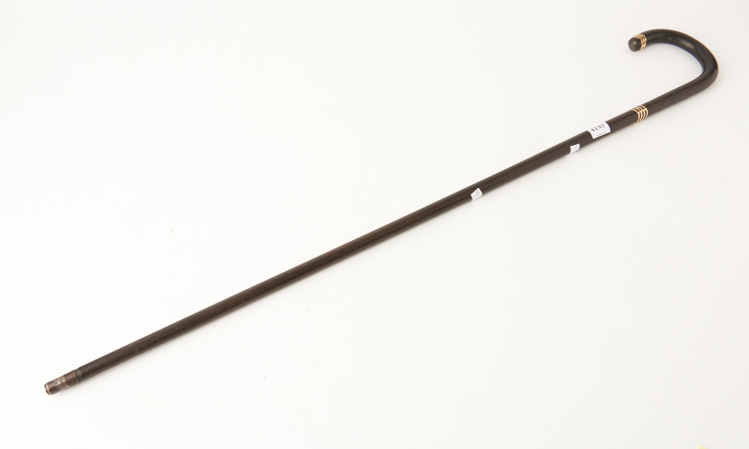 AN ENGLISH ROSEWOOD CURVED HANDLED WALKING STICK WITH TWO HALLMARKED 9CT GOLD BANDS, L.83CM, LEONARD JOEL LOCAL DELIVERY SIZE: SMALL