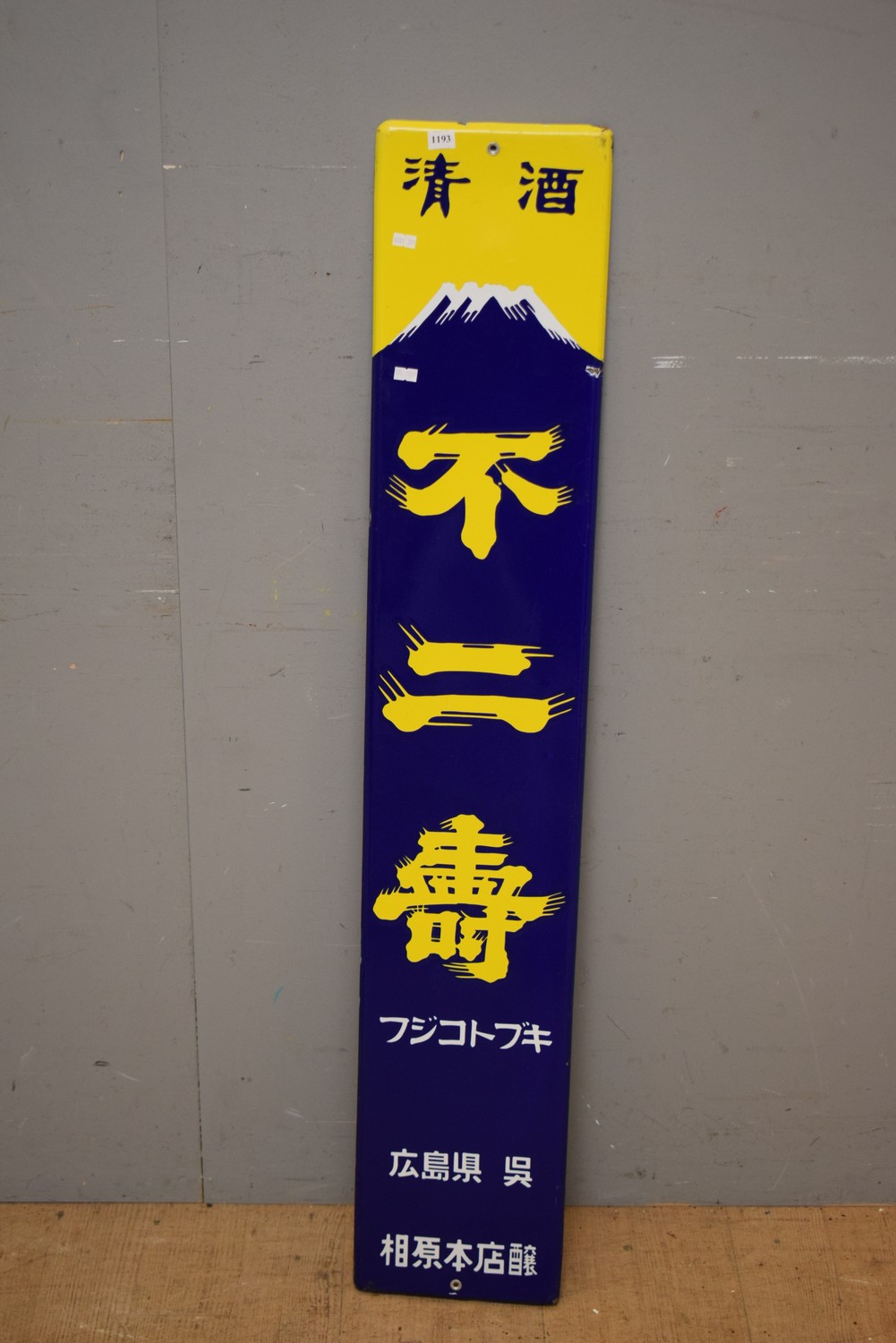 A 1920S JAPANESE BLUE AND YELLOW VERTICAL RECTANGULAR ADVERTISING SIGN (122H x 22W CM) (LEONARD JOEL DELIVERY SIZE: MEDIUM)