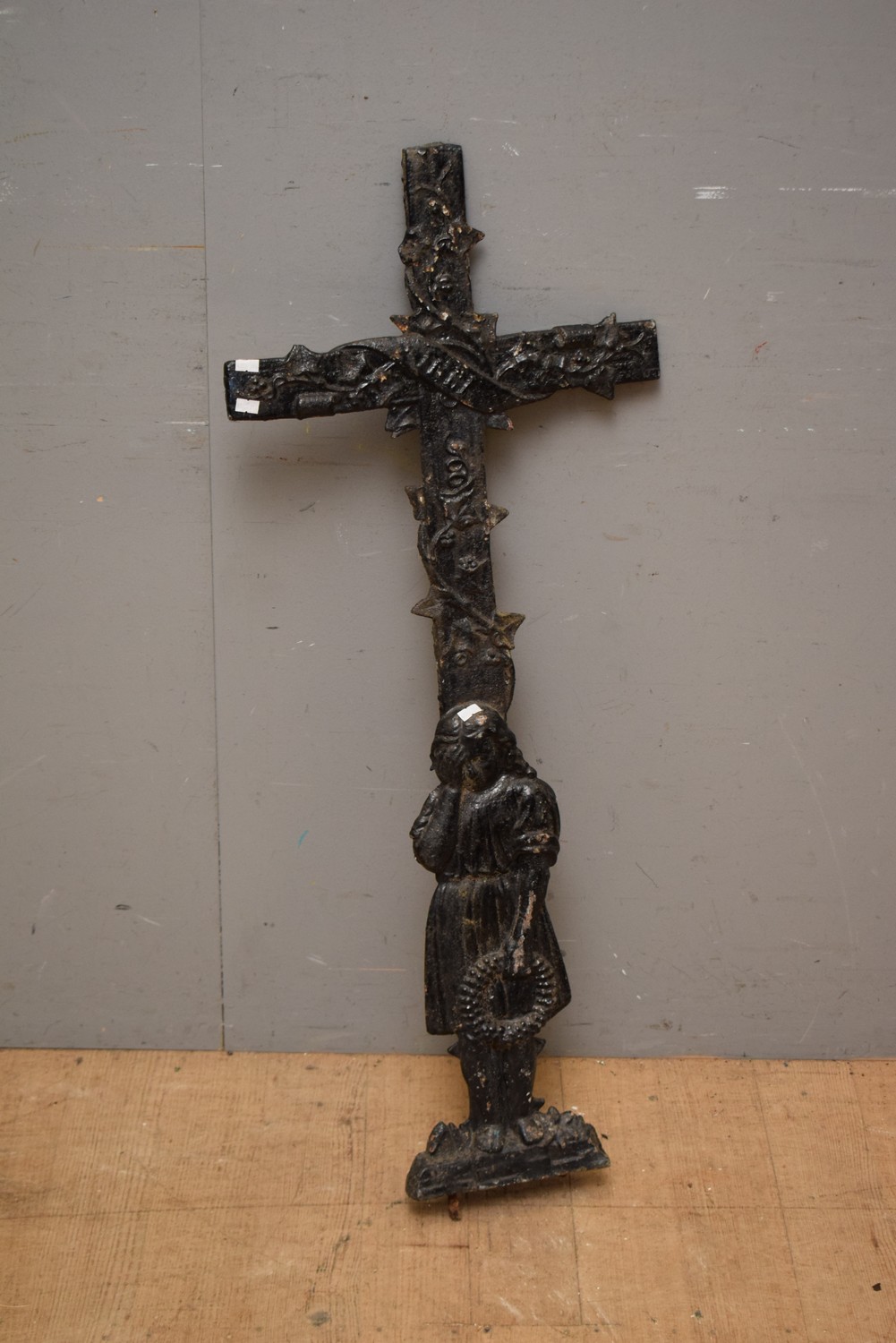 A 19TH CENTURY FRENCH CAST IRON CROSS WITH WEEPING FEMALE FIGURE TO BASE (106H x 43W CM) (PLEASE NOTE THIS HEAVY ITEM MUST BE REMOVED BY CARRIERS AT THE CUSTOMER'S EXPENSE. LEONARD JOEL STAFF CANNOT ASSIST CARRYING THIS ITEM) (X-LARGE ITEM)