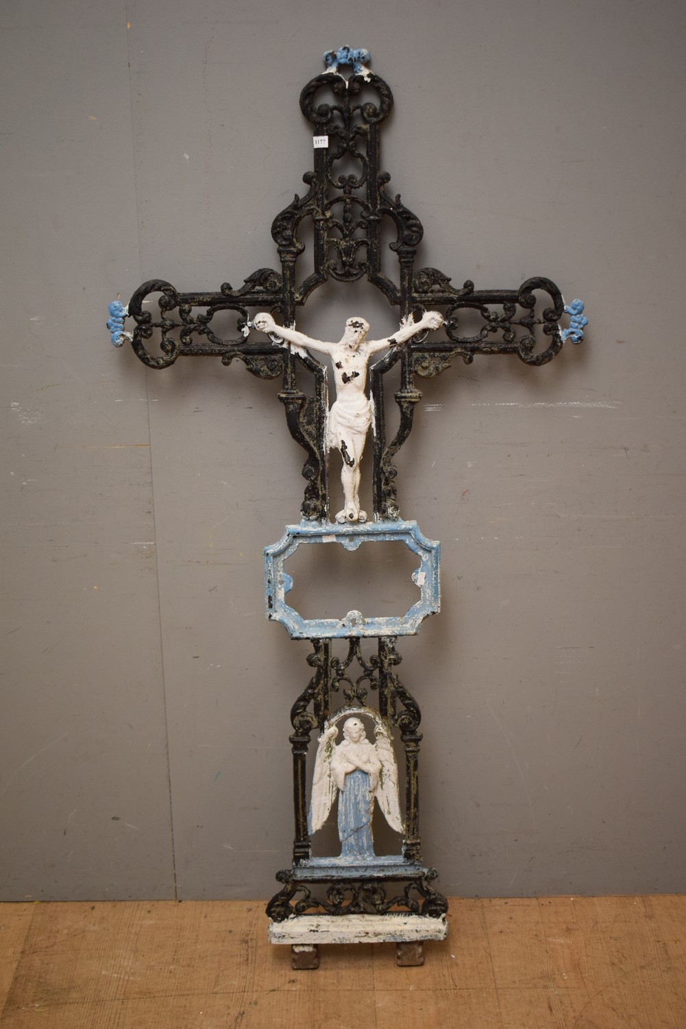 A LARGE 19TH CENTURY FRENCH CAST IRON CROSS WITH IMAGE OF JESUS IN CENTRE AND ANGLE FIGURE TO BASE - BLUE HIGHLIGHTS (159H x 78W CM) (PLEASE NOTE THIS HEAVY ITEM MUST BE REMOVED BY CARRIERS AT THE CUSTOMER'S EXPENSE. LEONARD JOEL STAFF CANNOT ASSIST CARRYING THIS ITEM) (X-LARGE ITEM)
