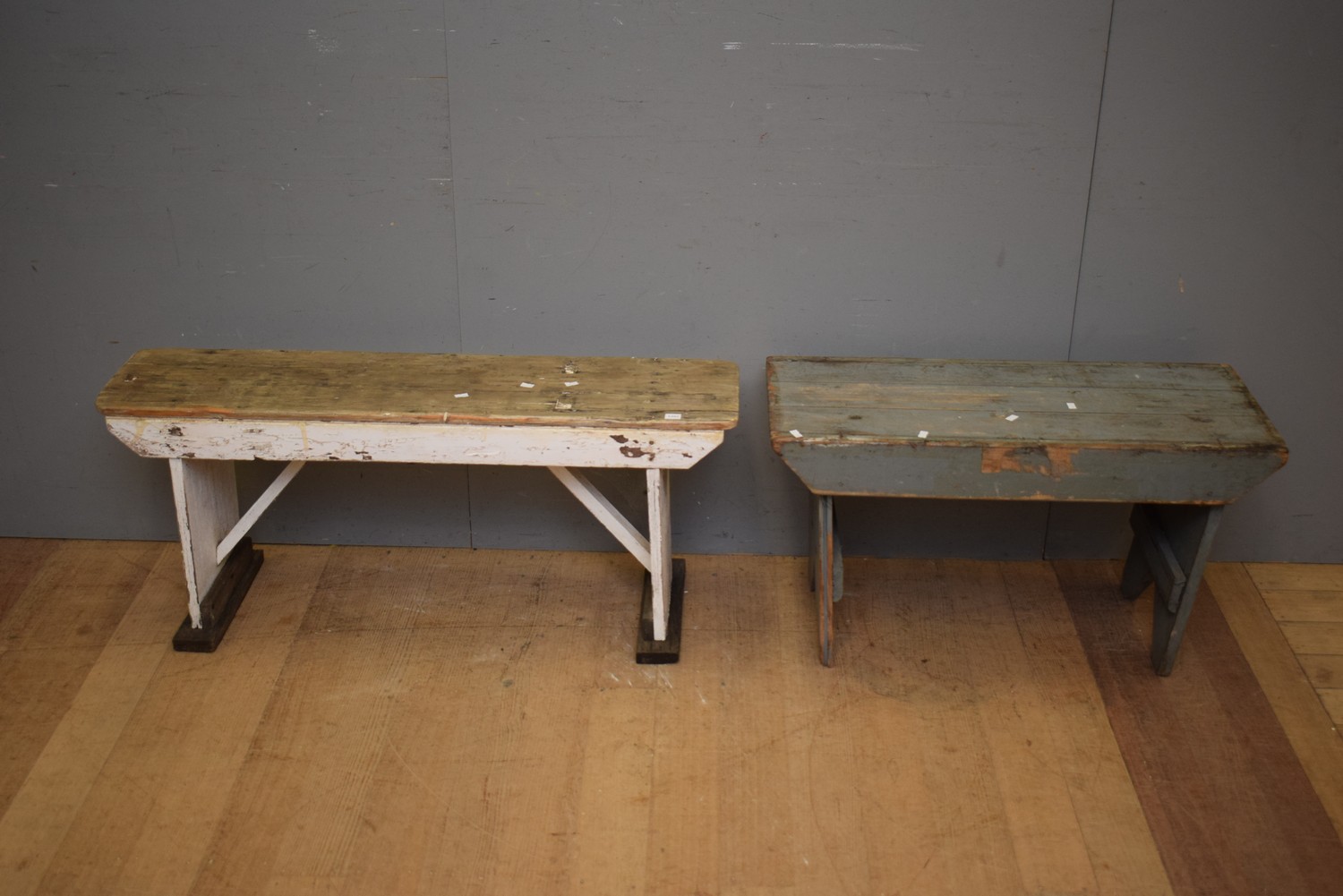 TWO 1900S AUSTRALIAN ORIGINAL PAINTED RUSTIC BENCHES - ONE WHITE AND ONE BLUE (LARGEST 45H x 107W x 26D CM) (LEONARD JOEL DELIVERY SIZE: MEDIUM)