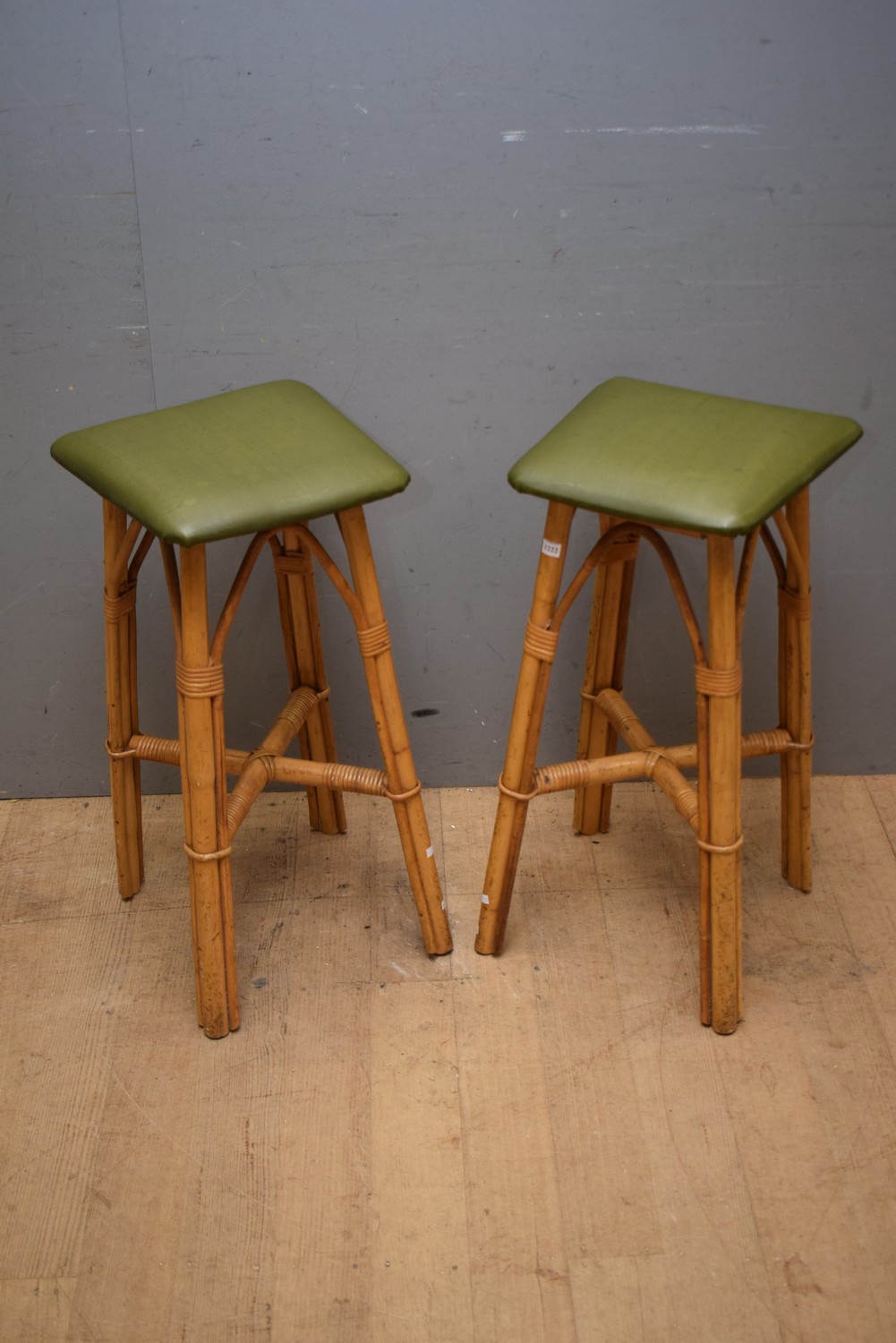 PAIR OF RETRO 1950S AUSTRALIAN MADE CANE STOOLS WITH ORIGINALGREEN UPHOLSTERY (71H x 35W x 36D CM) (LEONARD JOEL DELIVERY SIZE: LARGE)