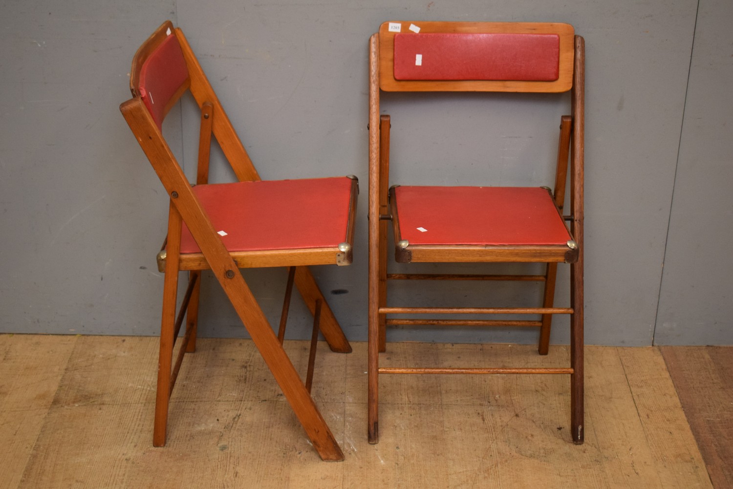 A PAIR OF 1940S FOLDING AUSTRALIAN TRUMP MODE FOLDING CHAIRS WITH ORIGINAL RED UPHOLSTERY (79H x 46W x 39D CM) (LEONARD JOEL DELIVERY SIZE: MEDIUM)
