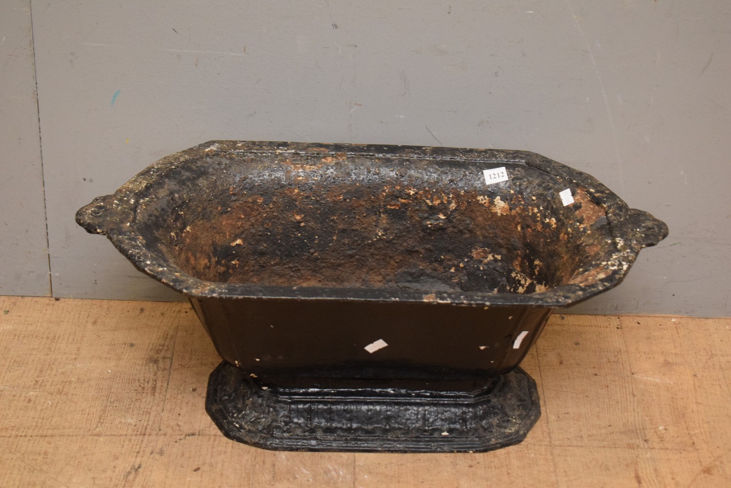 A 19TH CENTURY FRENCH PAINTED BLACK CAST IRON PLANTER WITH RAISED MOTIF TO ONE SIDE (23H x 54W x 34D CM) (LEONARD JOEL DELIVERY SIZE: MEDIUM)