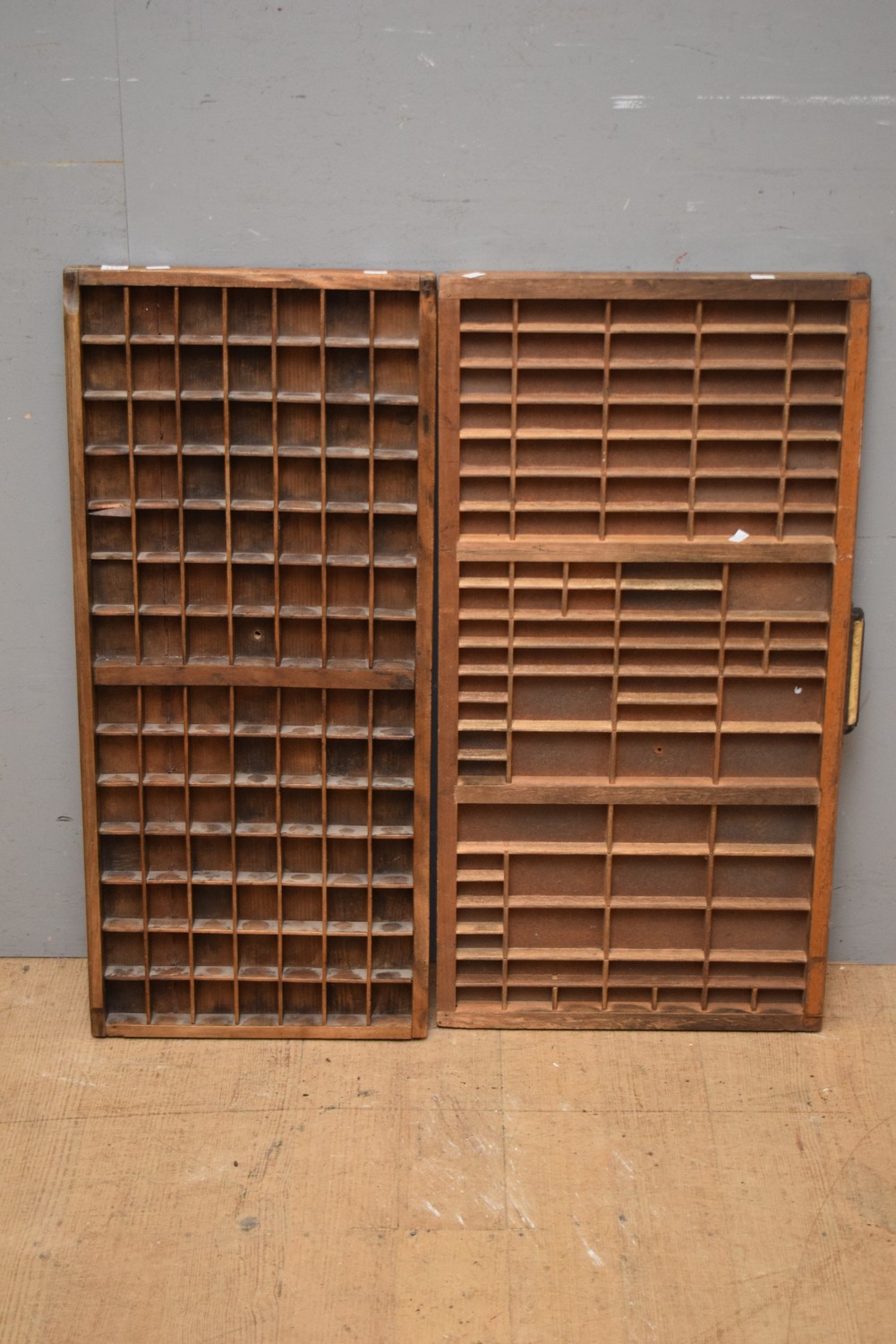 TWO MULTI SECTION 1900S WOODEN PRINTERS TRAYS (82H x 44W CM) (LEONARD JOEL DELIVERY SIZE: MEDIUM)
