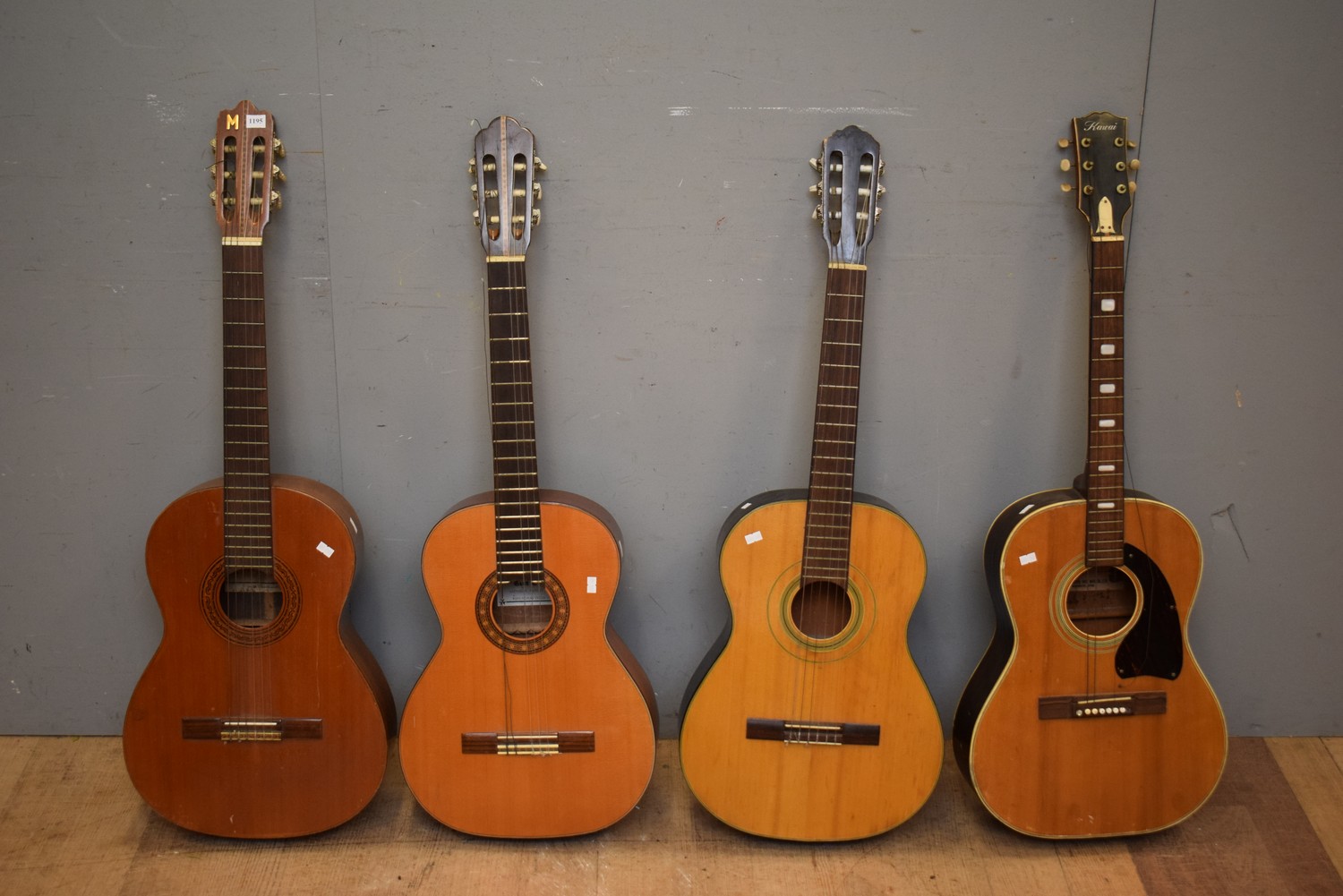 A GROUP OF 4 WOODEN ACOUSTIC GUITARS (A/F) (100H CM) (LEONARD JOEL DELIVERY SIZE: MEDIUM)
