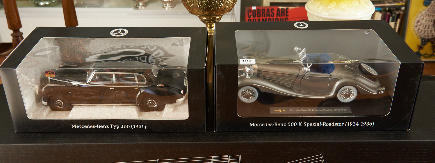 TWO 1:18 DIECAST SCALE MODELS, INCLUDING A 1934 MERCEDES-BENZ 500K SPEZIAL ROADSTER AND A 1951 MERCEDES-BENZ TYP 300, BOXED, LEONARD JOEL LOCAL DELIVERY SIZE: SMALL
