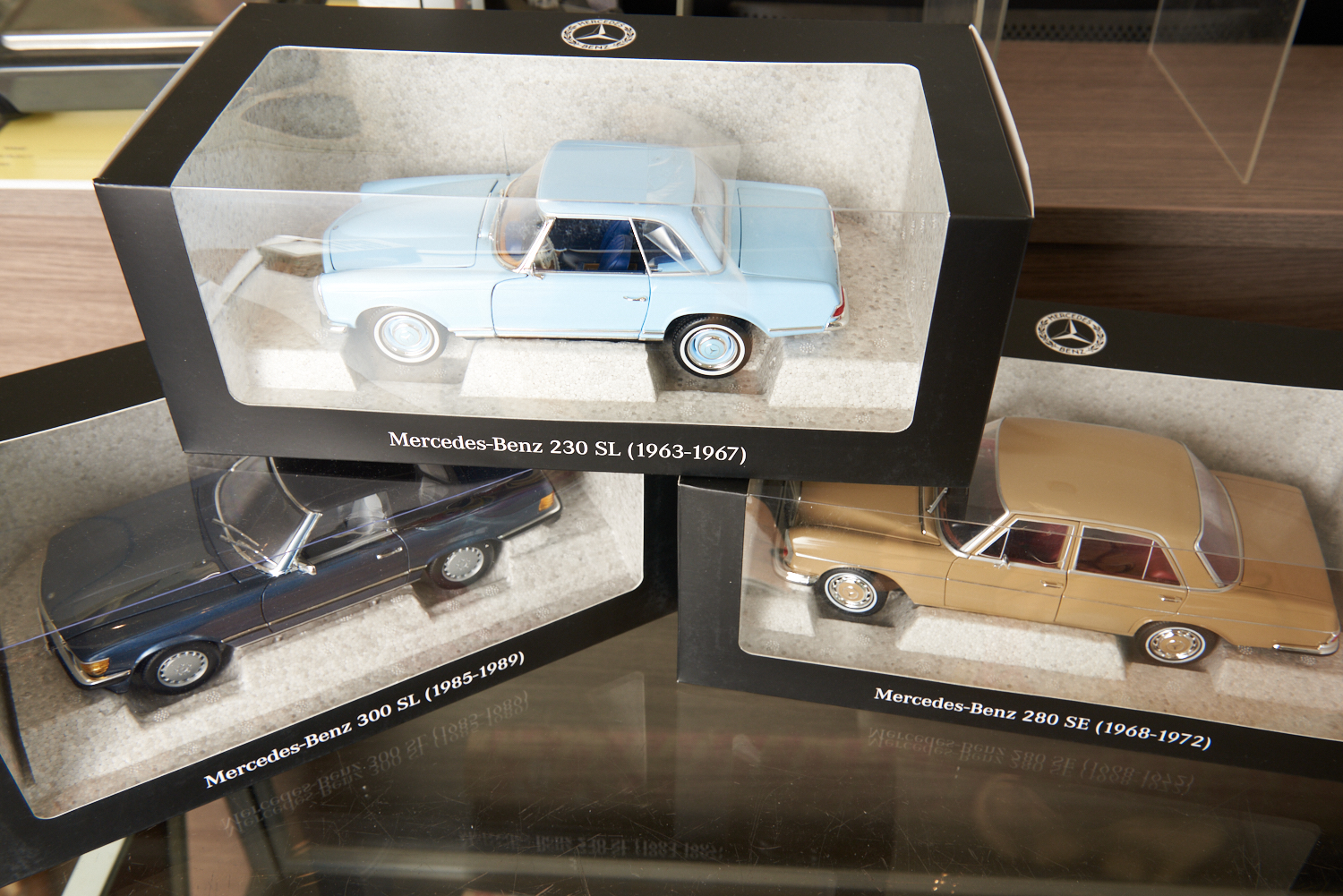THREE 1:18 DIECAST MODELS, INCLUDING A MERCEDES-BENZ 280SE (1967-1972), A MERCEDES-BENZ 230SL PAGODA (1963-1967) AND A MERCEDES-BENZ 300 SL, BOXED, LEONARD JOEL LOCAL DELIVERY SIZE: SMALL