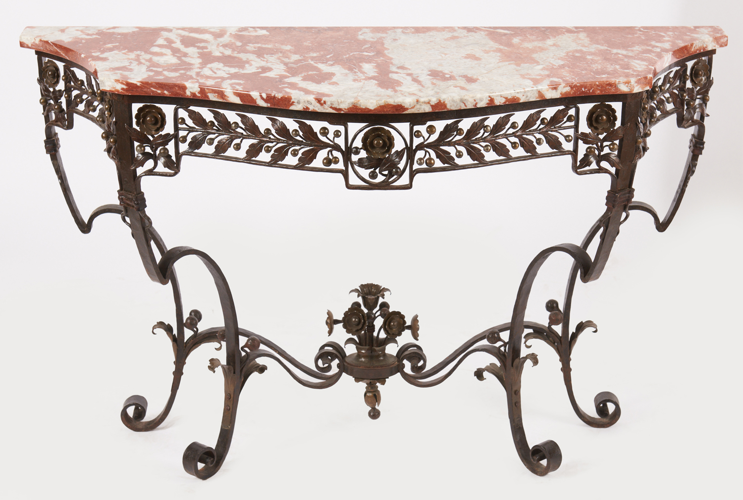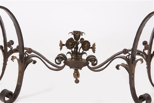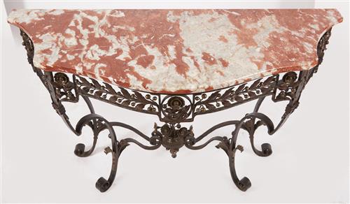 The serpentine rouge marble plate sitting upon a decorative wrought iron base, accented with flowers and foliate
