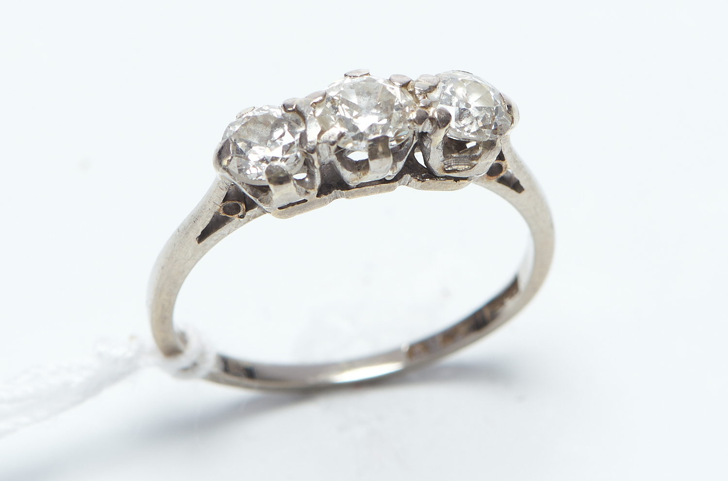 A THREE STONE DIAMOND RING IN 18CT WHITE GOLD AND PLATINUM, THE DIAMONDS TOTALLING APPROXIMATELY 0.80CT IN 18CT, SIZE J-K, 2.1GMS