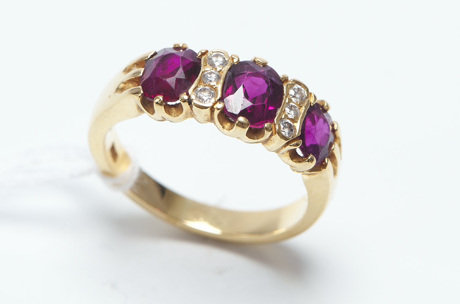 A THREE STONE RUBY AND DIAMOND RING IN 18CT GOLD, SIZE L, 5.1 GMS