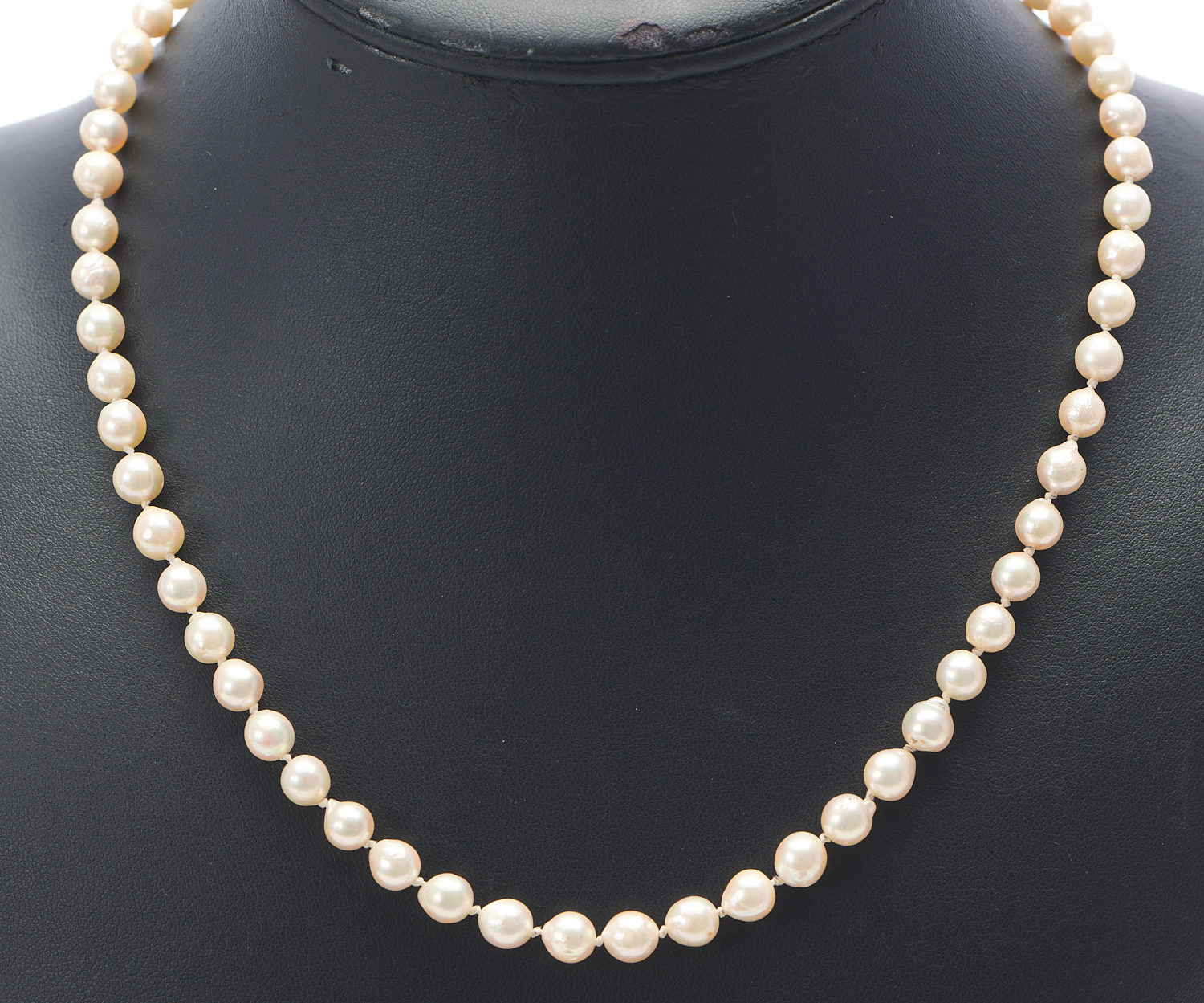A STRAND OF SEMI BAROQUE CULTURED PEARLS TO A SILVER CLASP, PEARLS MEASURING 6.0-7.0MM, LENGTH 47CMS