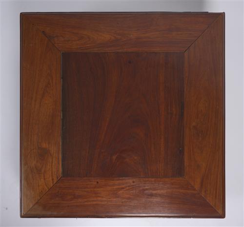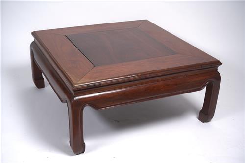 The low square table with curved aprons and inwardly curved legs. The top boards of huanghuali and the rest a dark hardwood.