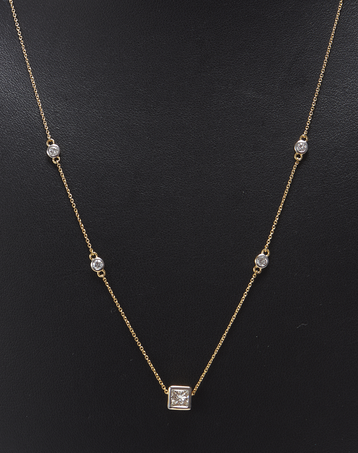A DIAMOND PENDANT WITH CHAIN IN 18CT GOLD, FEATURING A PRINCESS CUT DIAMOND WEIGHING 0.79CT, TO A FINE TRACE CHAIN BEZEL SET WITH DIAMONDS, TOTAL LENGTH 53CMS
