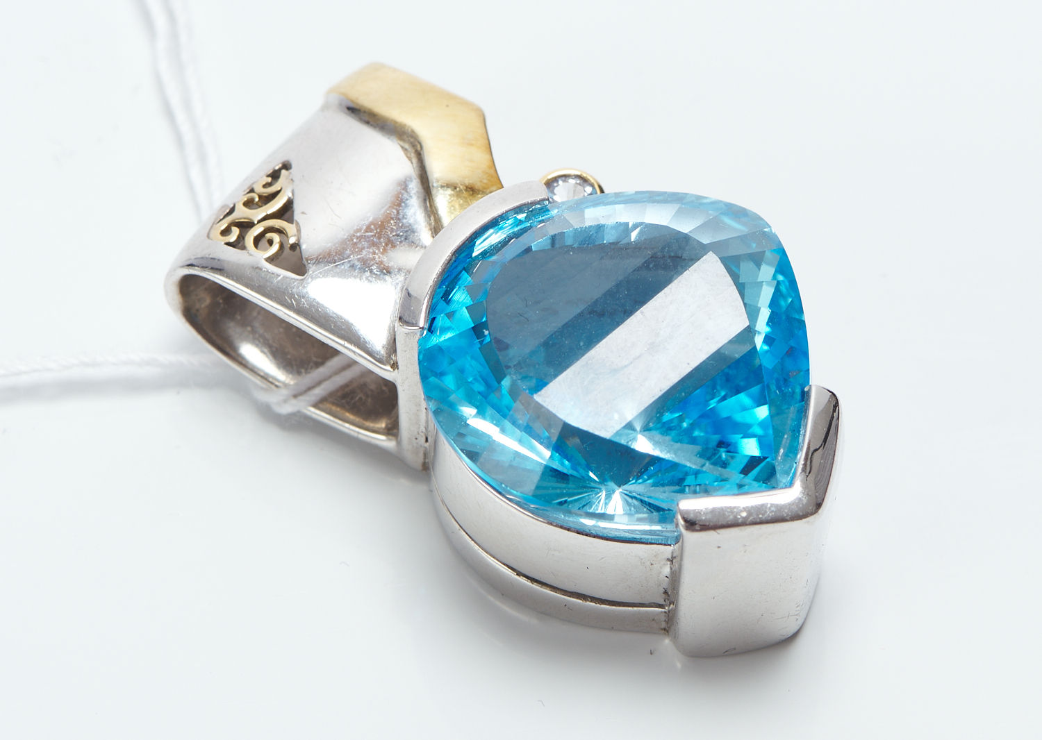 A FANCY CUT BLUE TOPAZ PENDANT IN STERLING SILVER AND 18CT GOLD, LENGTH 35MM, 23.3GMS
