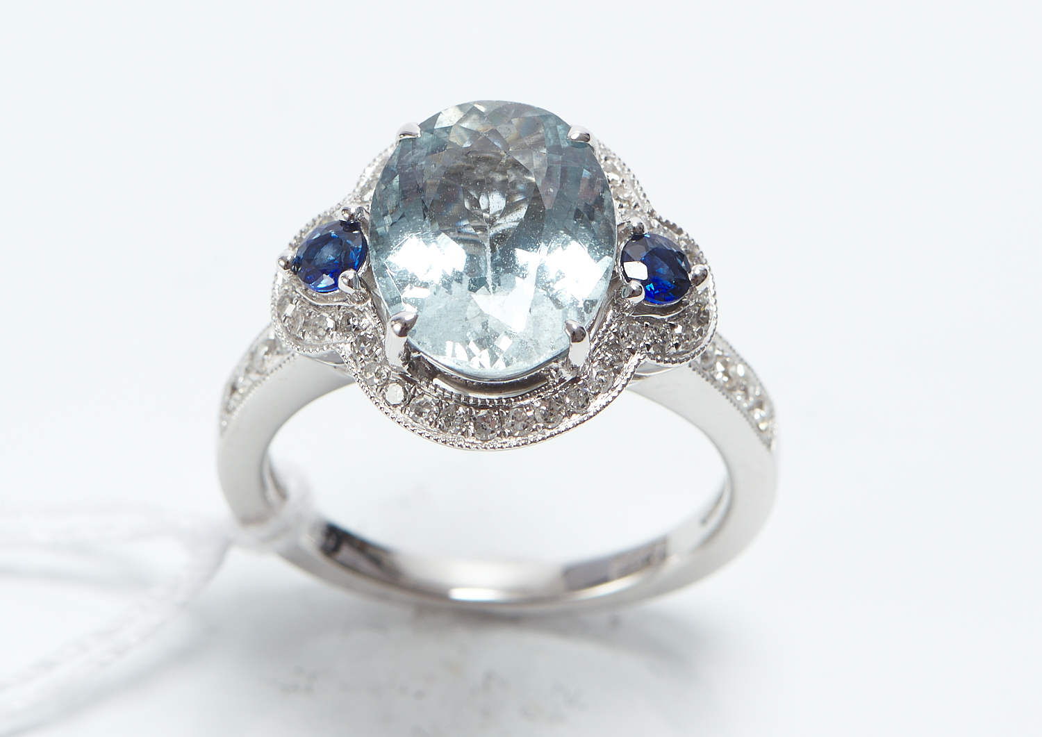 AN AQUAMARINE, BLUE SAPPHIRE AND DIAMOND DRESS RING IN 18CT WHITE GOLD, CENTRALLY SET WITH AN OVAL CUT AQUAMARINE OF 3.28CTS, FLANKED BY TWO ROUND CUT BLUE SAPPHIRES, WITHIN A BORDER OF DIAMONDS AND DIAMOND SET SHOULDERS, SIZE O, 6.8GMS