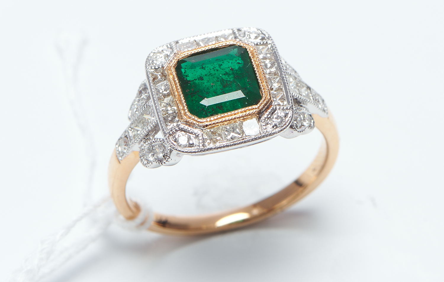 AN EMERALD AND DIAMOND DRESS RING IN TWO TONE 18CT GOLD, FEATURING AN EMERALD CUT EMERALD OF 1.36CTS, WITHIN A SURROUND OF ROUND BRILLIANT CUT DIAMONDS AND DIAMOND SET SHOULDERS, SIZE P, 3.9GMS