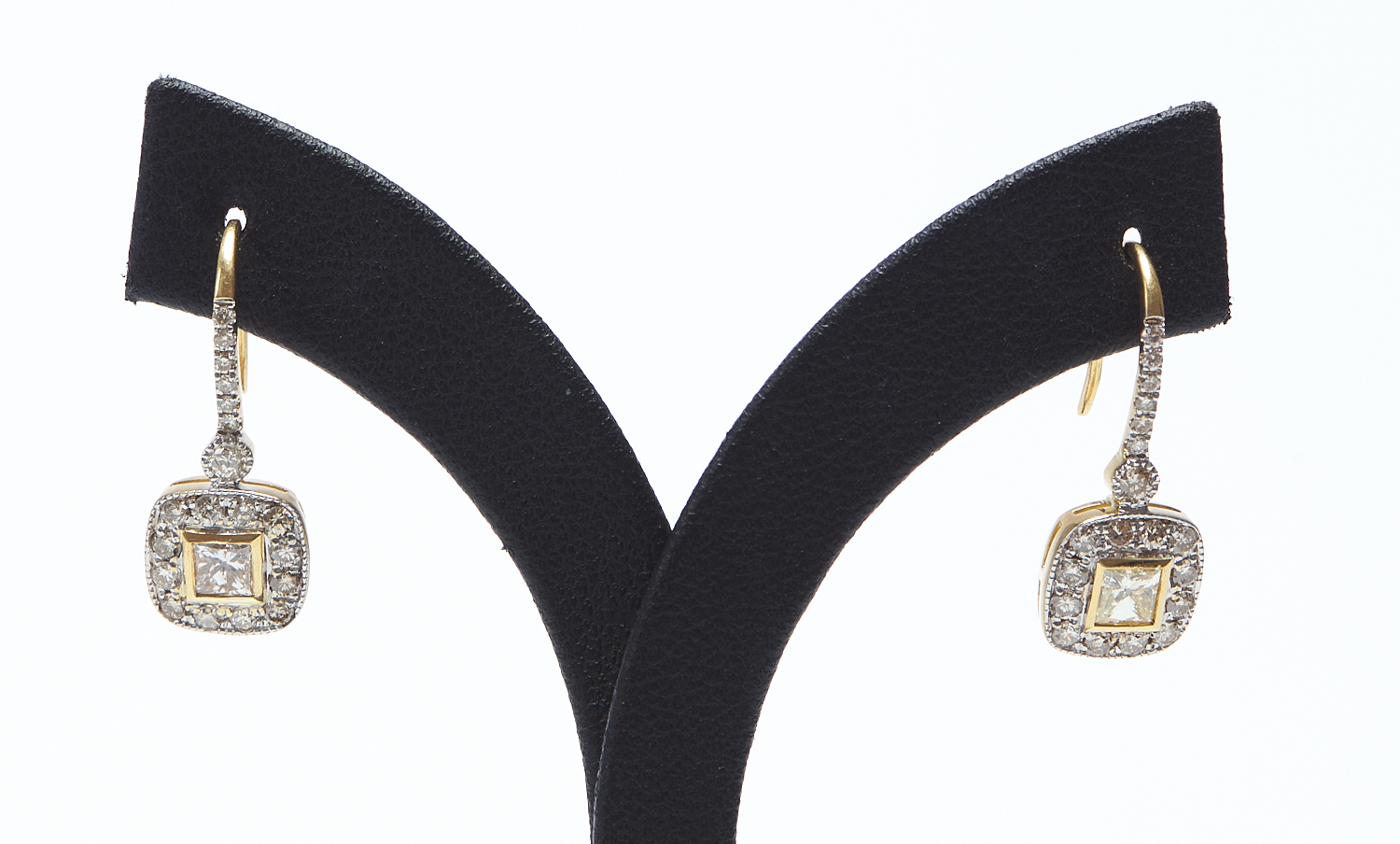 A PAIR OF DIAMOND EARRINGS IN 18CT GOLD, COMPRISING PRINCESS CUT AND ROUND BRILLIANT CUT DIAMONDS TOTALLING 1.00CT, TO SHEPHERD HOOK FITTINGS, LENGTH 22MM
