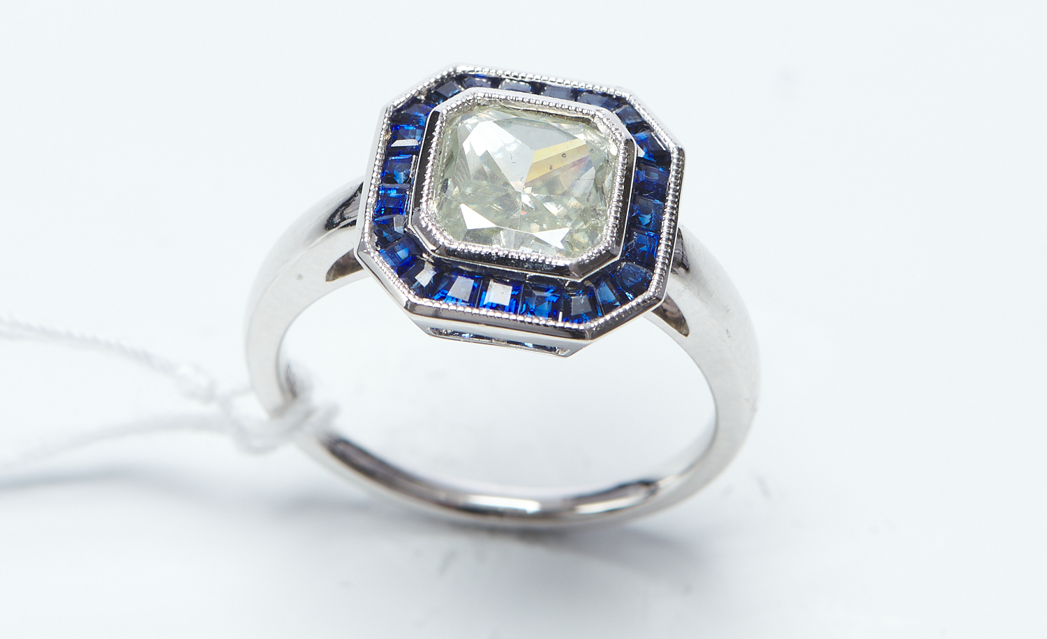 AN ART DECO INSPIRED MOISSANITE AND SAPPHIRE RING IN 18CT WHITE GOLD, CENTRALLY SET WITH A RADIANT CUT MOISSANITE WEIGHING 1.24CTS WITHIN A BORDER OF CALIBRÉ CUT BLUE SAPPHIRES TOTALLING 0.78CT, SIZE N, 4.3GMS