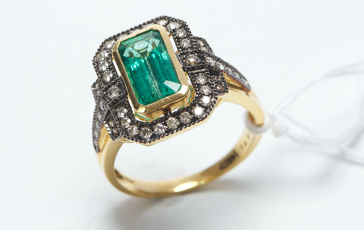 AN ART DECO STYLE EMERALD AND DIAMOND RING IN 18CT GOLD, FEATURING A RECTANGULAR EMERALD CUT EMERALD WEIGHING 2.04CTS, WITHIN A SURROUND OF ROUND BRILLIANT CUT DIAMONDS AND DIAMOND SET SHOULDERS, TOTALLING 0.41CT, SIZE L-M, 5.2GMS