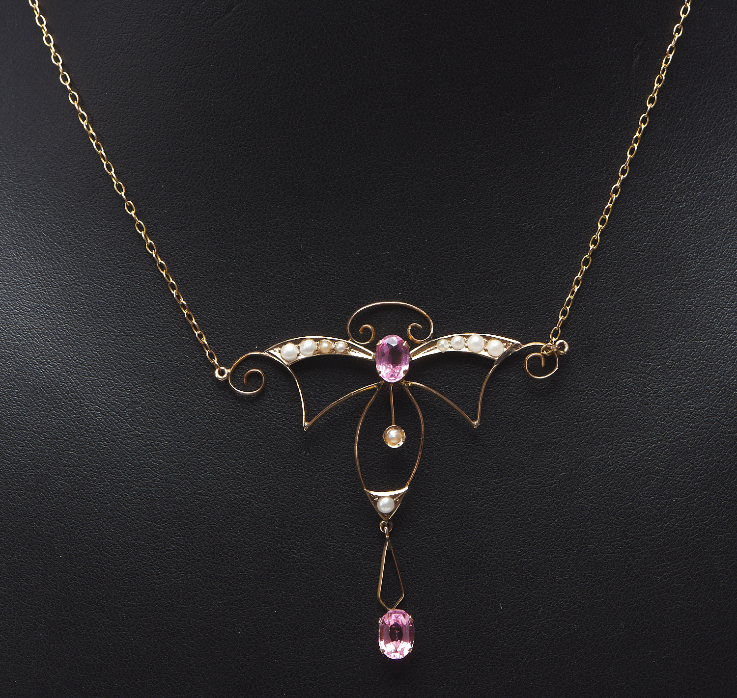 AN EDWARDIAN NECKLACE IN 9CT GOLD, COMPRISING PINK PASTE AND SEED PEARLS, TO A BAYONET CLASP, TOTAL LENGTH 41CMS, 3.1GMS